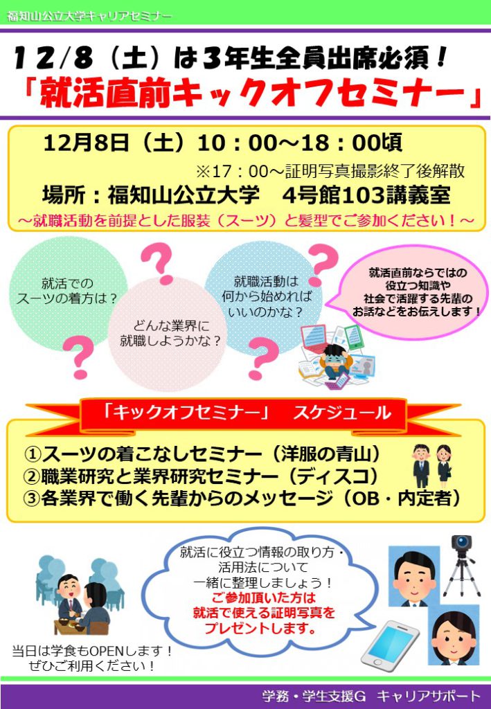 就職活動をされる3年生は全員出席してください。