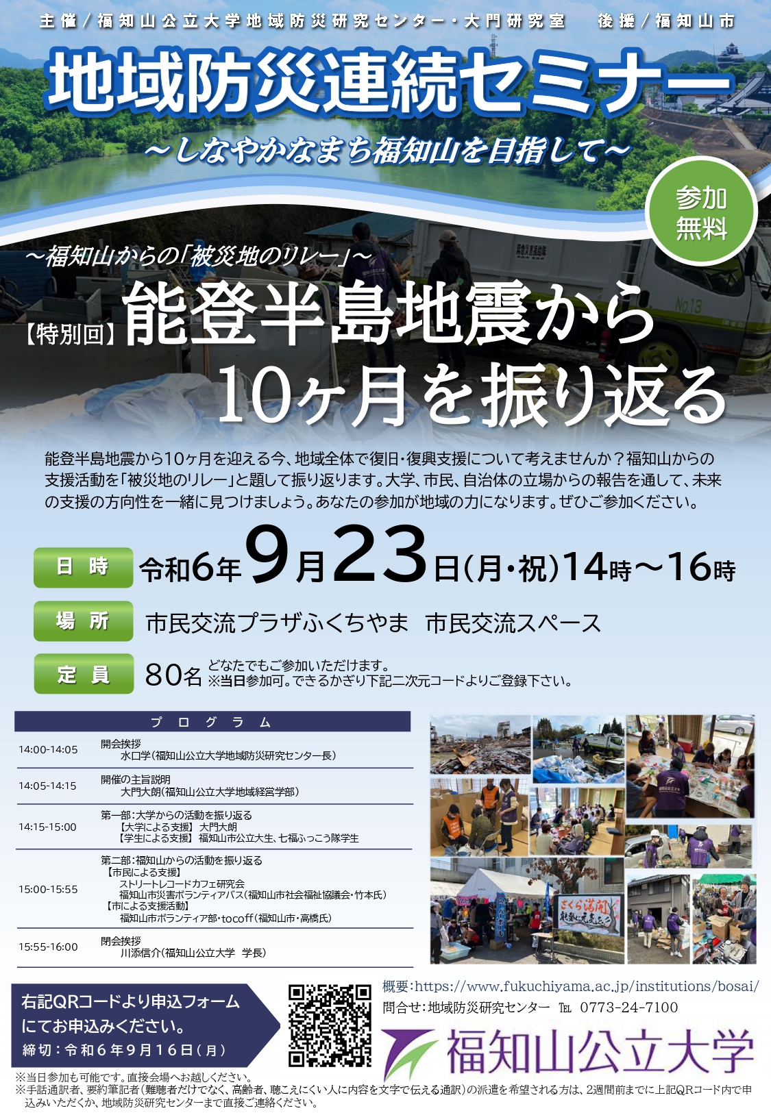 能登半島地震から10ヶ月を迎える今、地域全体で復旧・復興支援について考えませんか?福知山からの支援活動を「被災地のリレー」と題して振り返ります。大学、市民、自治体の立場からの報告を通して、未来の支援の方向性を一緒に見つけましょう。あなたの参加が地域の力になります。ぜひご参加ください。