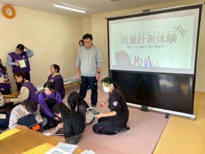 - 大学で制作した雨量計を使い、GIGAスクール構想のもとで小・中学校に配布されているタブレットを使用して、公立大学の学生から雨量計測について学んだ。