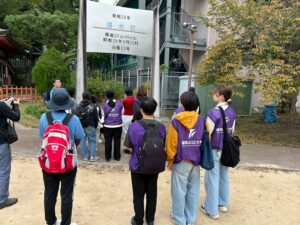 御霊公園では、昭和28年に襲った台風13号の影響で、由良川が氾濫し、当時の水位が記されており、地域の歴史を学習しました。