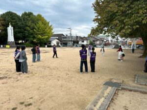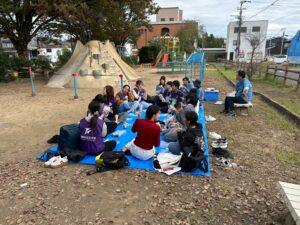 御霊公園で公立大学生と児童館からの参加者でお昼ごはんを一緒に食べたり、レクリエーションをして異年齢交流を図りました。