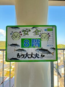 - 最上階が8階になるため、何階にいるのかを視覚的にわかるように地元の中学生が描いた標識が各フロアーにあります。