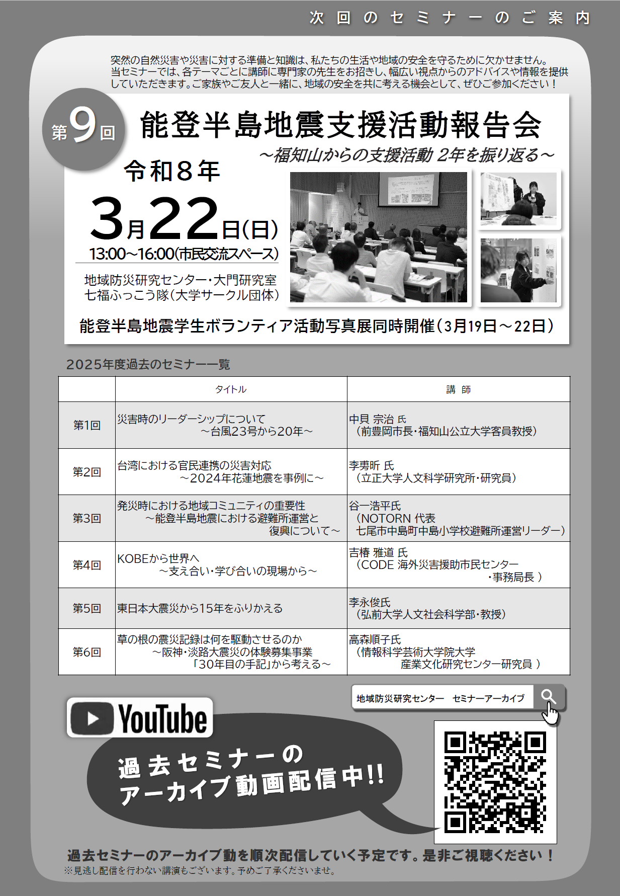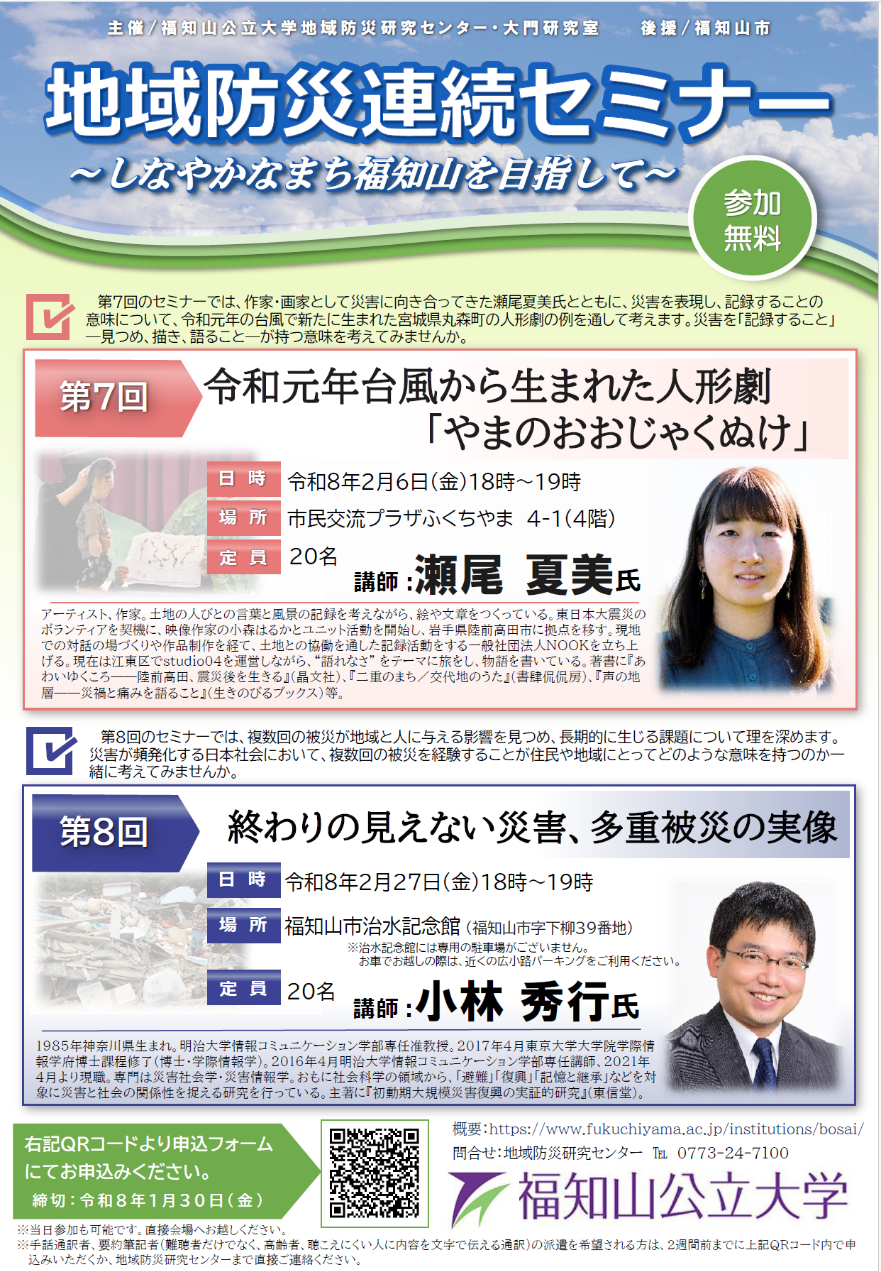 センター及び本学地域経営学部・大門大朗研究室主催により、地域防災連続セミナーを市民交流プラザふくちやま(福知山市)で開催します。関心のある方はどなたでも参加可能ですので、ぜひお申込みください。