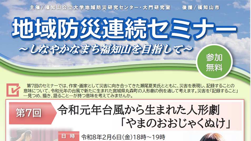 センター及び本学地域経営学部・大門大朗研究室主催により、地域防災連続セミナーを市民交流プラザふくちやま(福知山市)で開催します。関心のある方はどなたでも参加可能ですので、ぜひお申込みください。