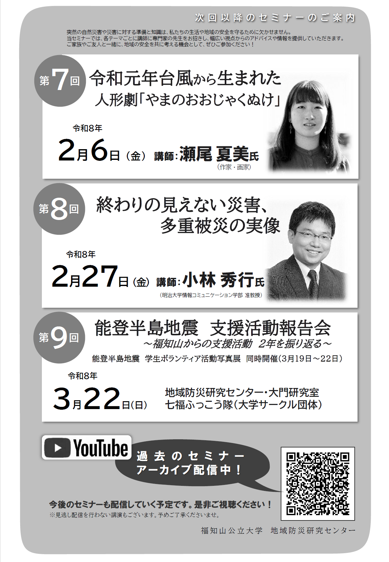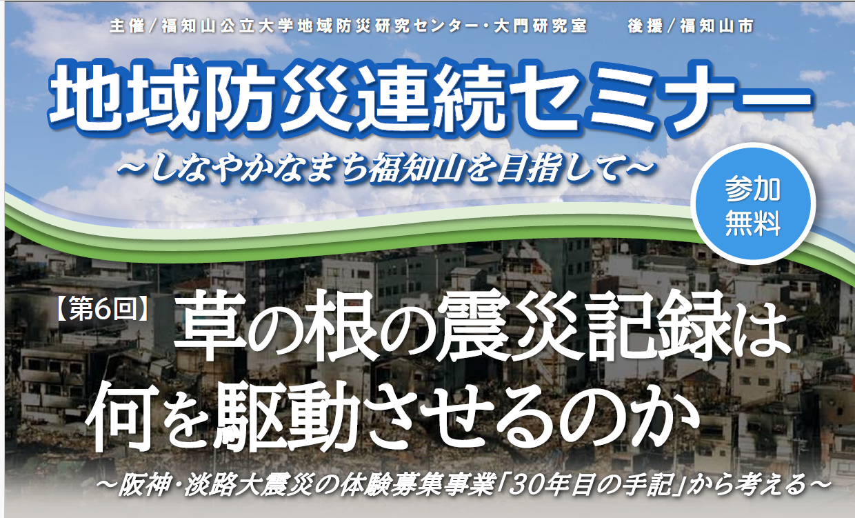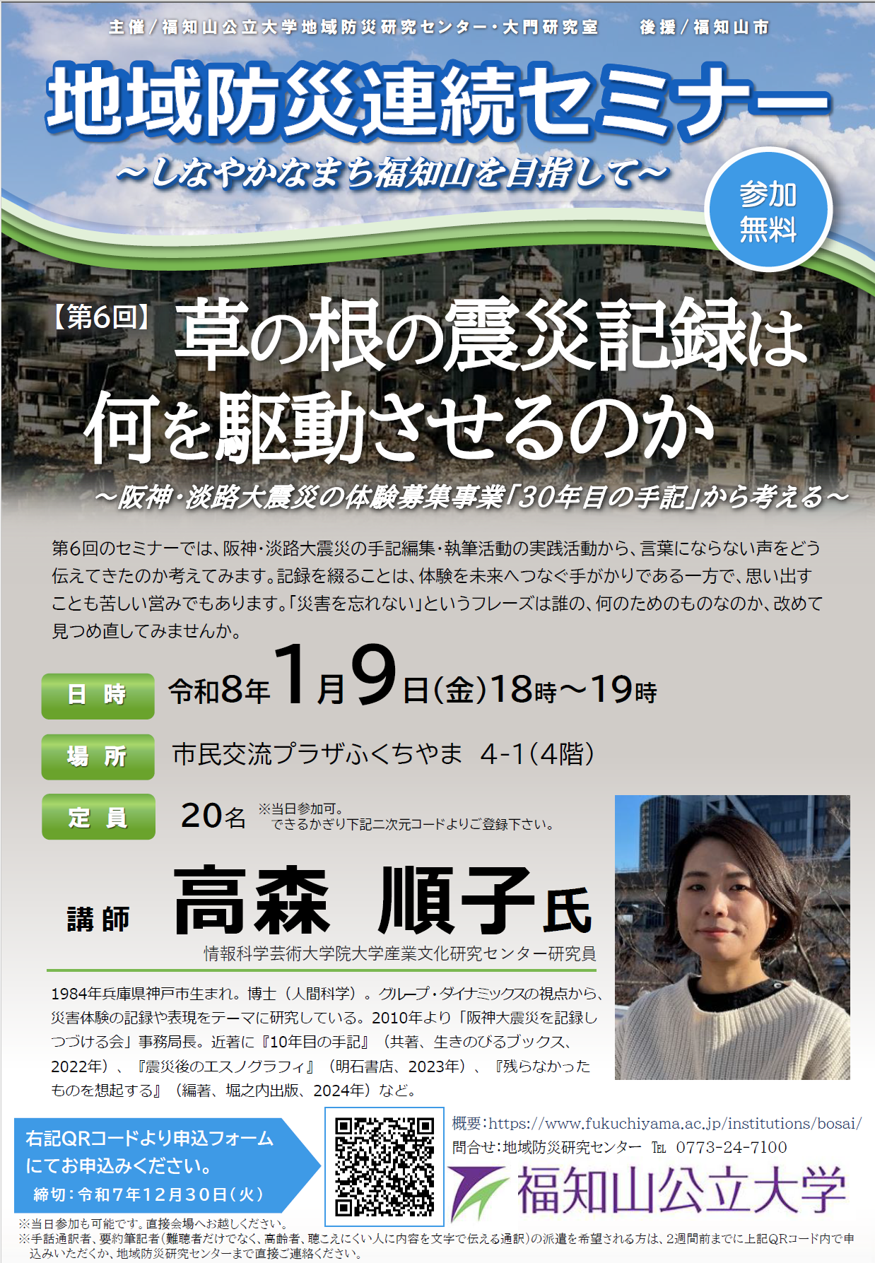 センター及び本学地域経営学部・大門大朗研究室主催により、地域防災連続セミナーを市民交流プラザふくちやま(福知山市)で開催します。関心のある方はどなたでも参加可能ですので、ぜひお申込みください。