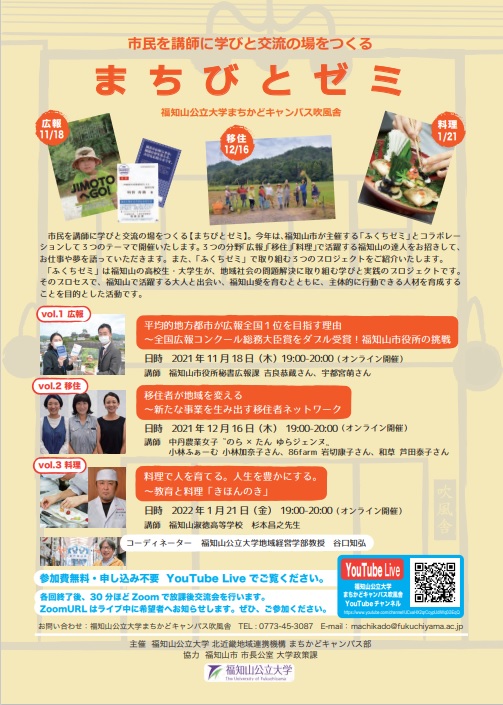 市民を講師に学びと交流の場をつくる「まちびとゼミ」。2021年度は、福知山市主催の「ふくちゼミ」とコラボレーションして3つのテーマでオンライン開催します。当日は、まちかどキャンパス「吹風舎」からYouTube Liveで配信(申し込み不要、参加費無料)しますので、ぜひご覧ください。