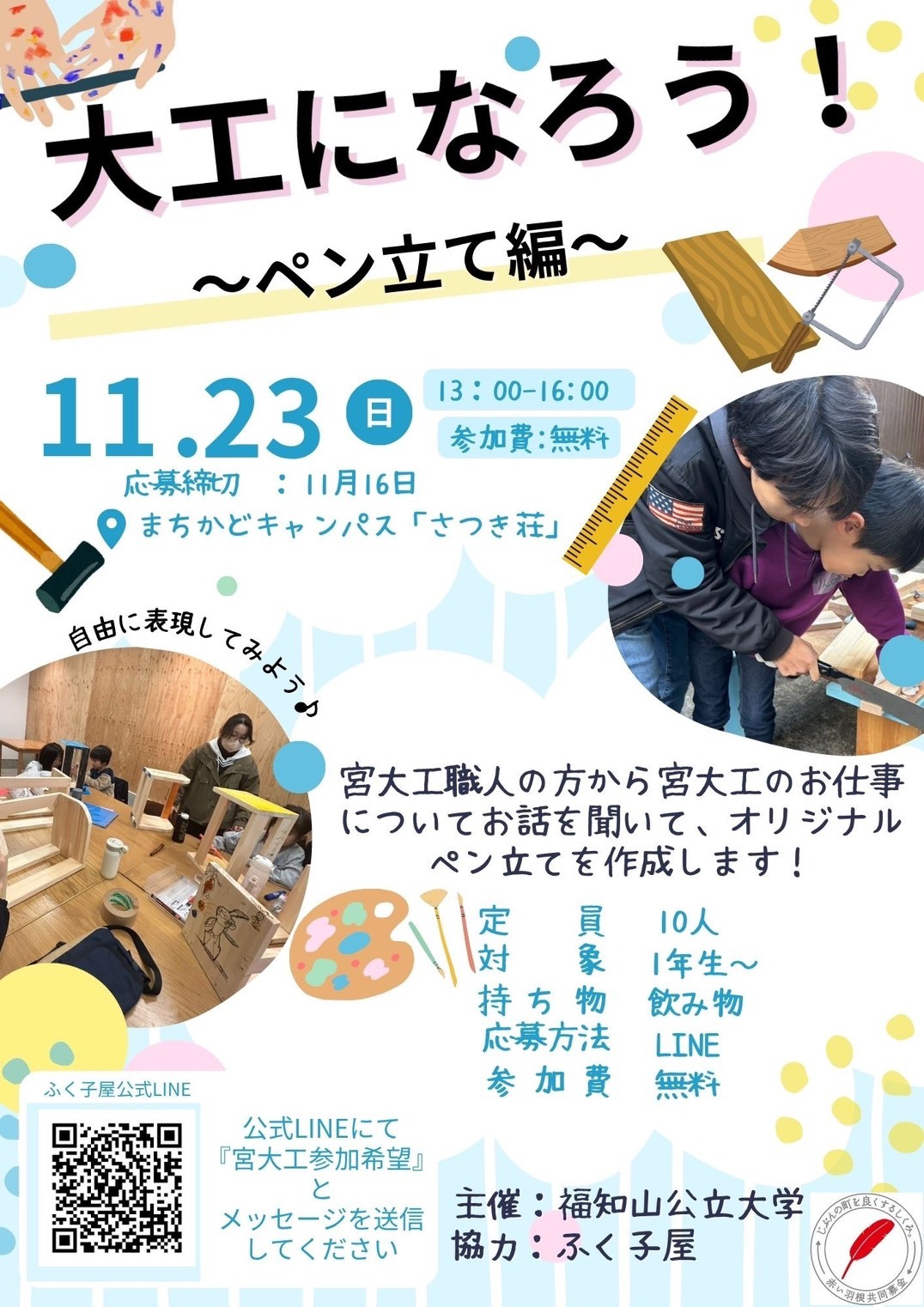 2025年11月23日(日)、子ども体験クラブ「大工さんの仕事を知ろう!」を、まちかどキャンパス「吹風舎」で実施します。