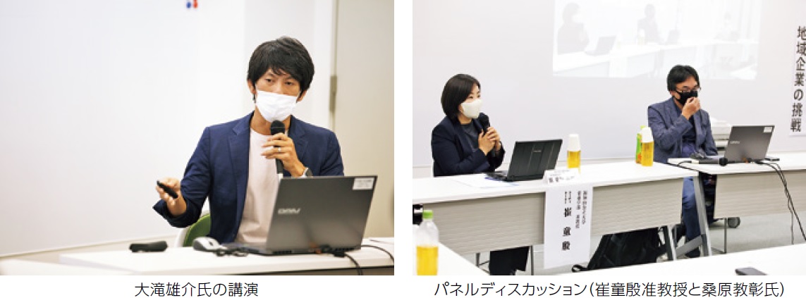 2022年9月28日(水)、2022年度第2回市民講座「まちづくりにおける地域企業の挑戦」を本学2号館Co-lab.スペースを会場に開催しました。当日は45人の参加があり、桑原教彰氏(京都工芸繊維大学教授/地域創生Tech Program長)と大滝雄介 氏(株式会社大滝工務店代表取締役、一般社団法人KOKIN 代表理事/合同会社HOUKO代表)に講演をいただきました。