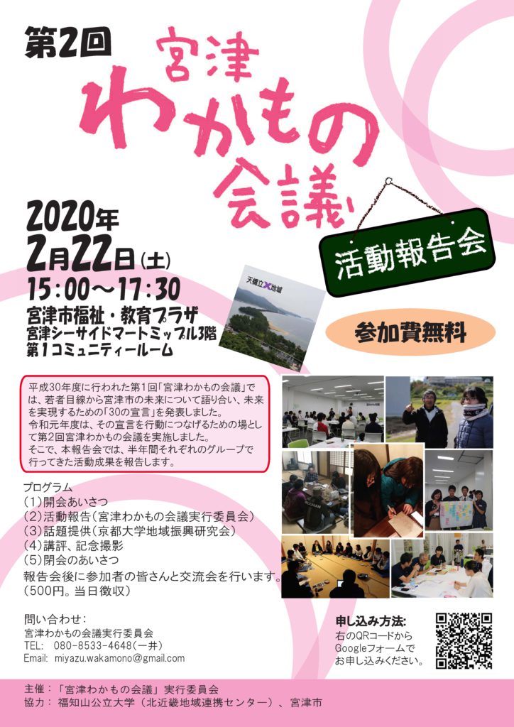 2020年2月22日(土)、宮津市福祉・教育プラザにて「第2回宮津わかもの会議 活動報告会」を開催します。