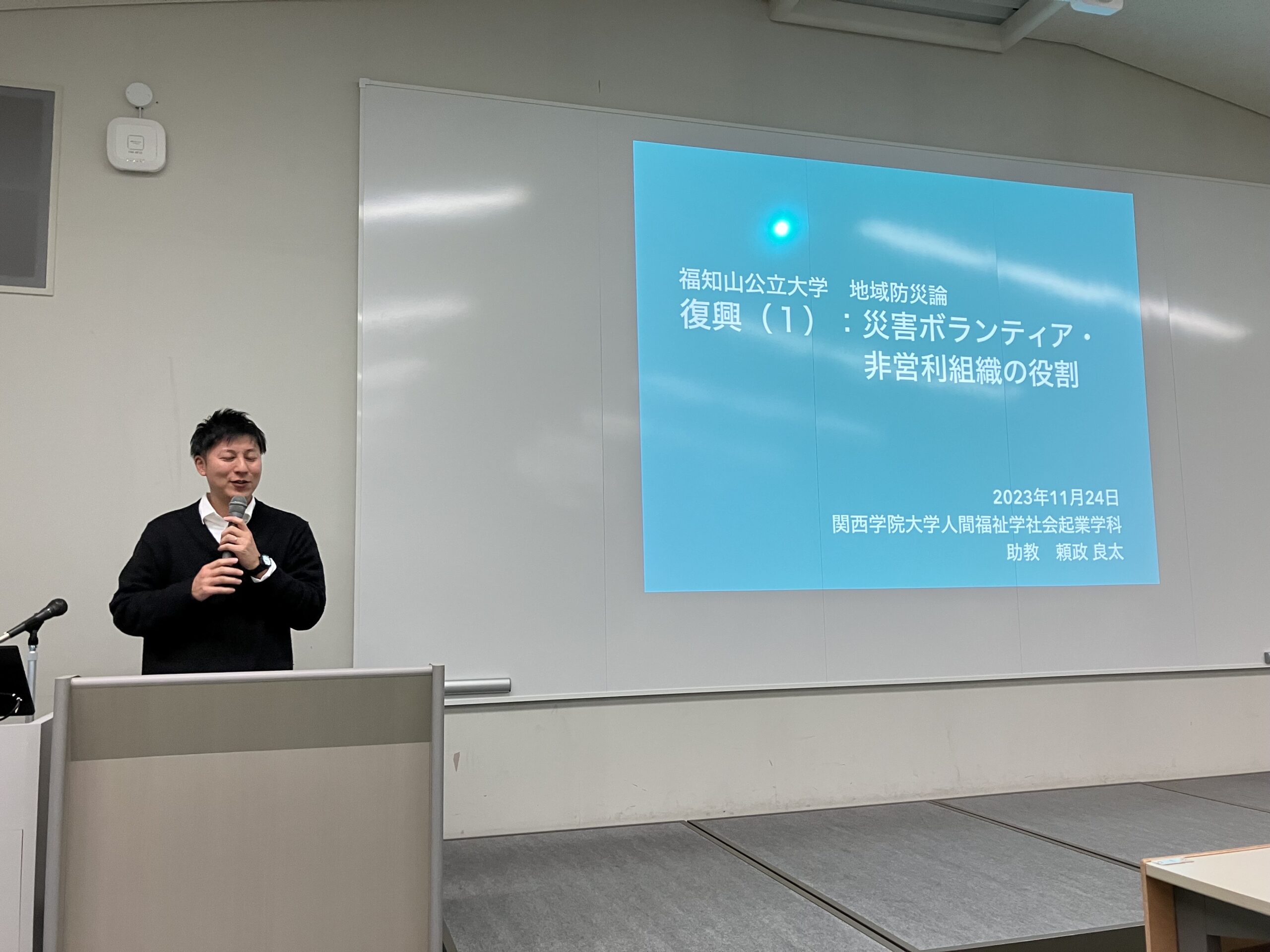 同日に本学で行った講義「地域防災論」(担当:大門大朗准教授、水口学地域防災研究センター長)にも特別講師としてご登壇いただき、学生向けの講義を行っていただきました。学生からは「新しいボランティアの形を知ることができてよかった」「被災者に寄り添うようなボランティアも存在しているということを知れてよかった」などの感想が寄せられました。
