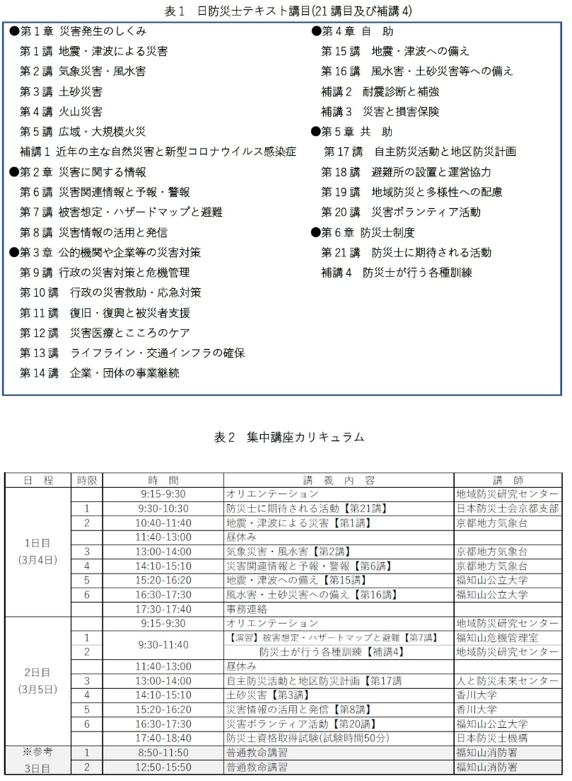 テキストの講目(表1)のうち12講座を2日間の集中講座(表2)で実施します。