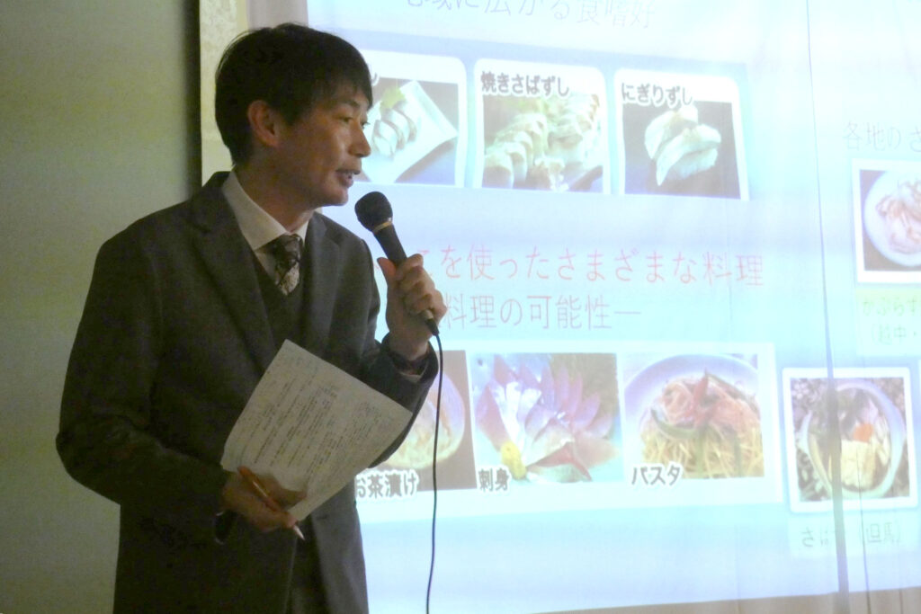 当日は、日本各地のさば食文化に関する報告・パネルディスカッションのほか、さば(青魚)を塩漬けにした後、糠漬けにする郷土料理「へしこ」の試食などが行われました。小山教授は、コーディネーターとしてパネルディスカッションに登壇し、兵庫県から石川県にかけての日本海側で漁獲されるさばにまつわる食文化をはじめ、その継承や新メニューの開発などについて紹介しました。