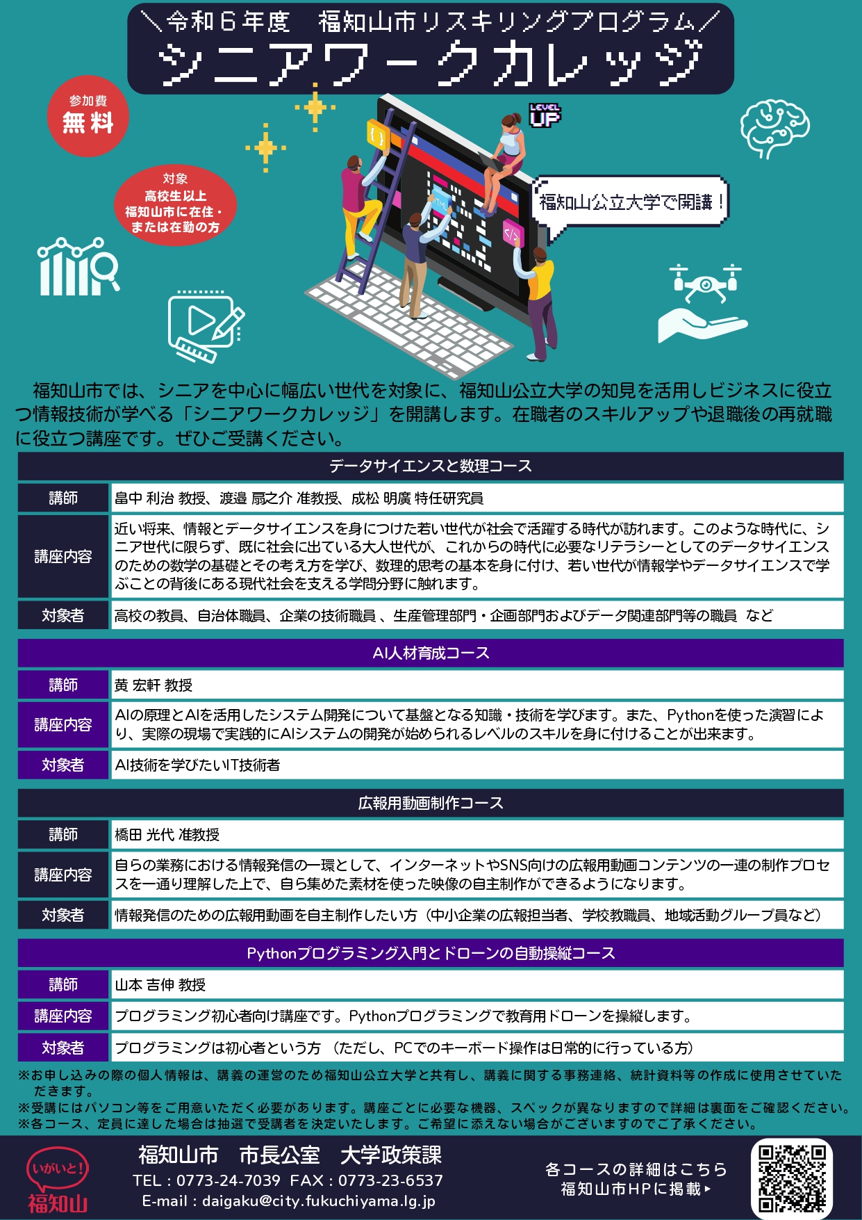 シニアを中心に幅広い世代を対象とした、ビジネスに役立つ情報技術を学べる「シニアワークカレッジ(福知山市委託事業)」を開講します。在職者のスキルアップや退職後の再就職に役立つ講座です。ぜひご受講ください。
