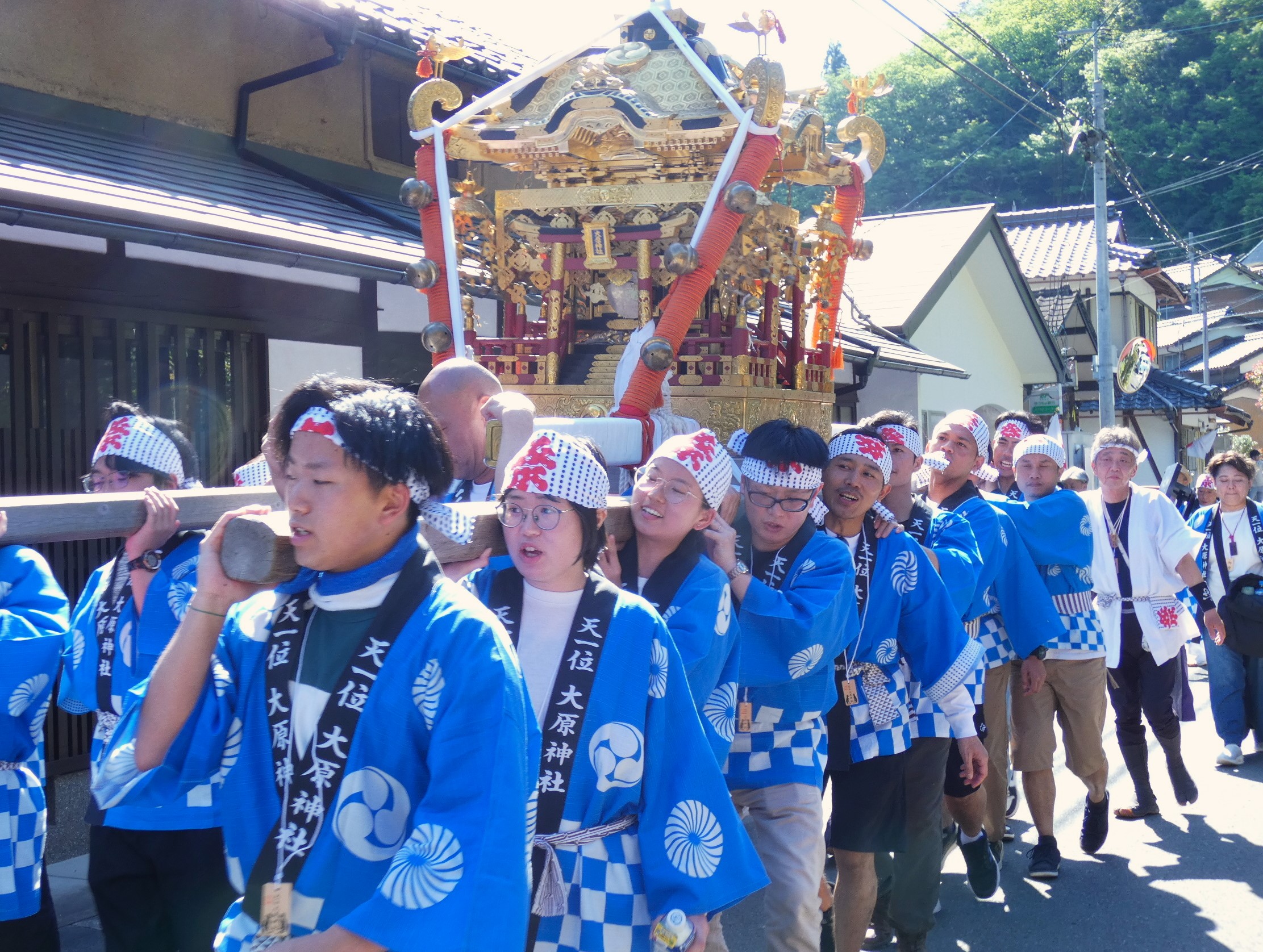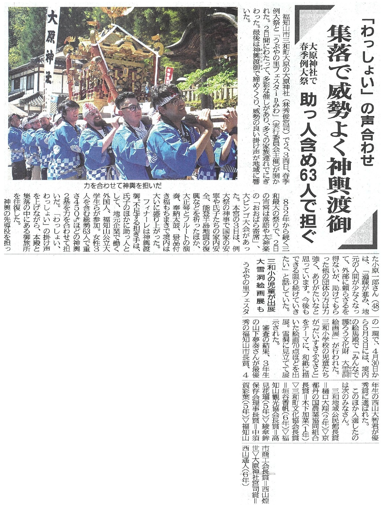 両丹日日新聞 2024年5月7日(火)【「わっしょい」の声合わせ 集落で威勢よく神輿渡御 大原神社で春季例大祭助っ人含め63人で担ぐ】