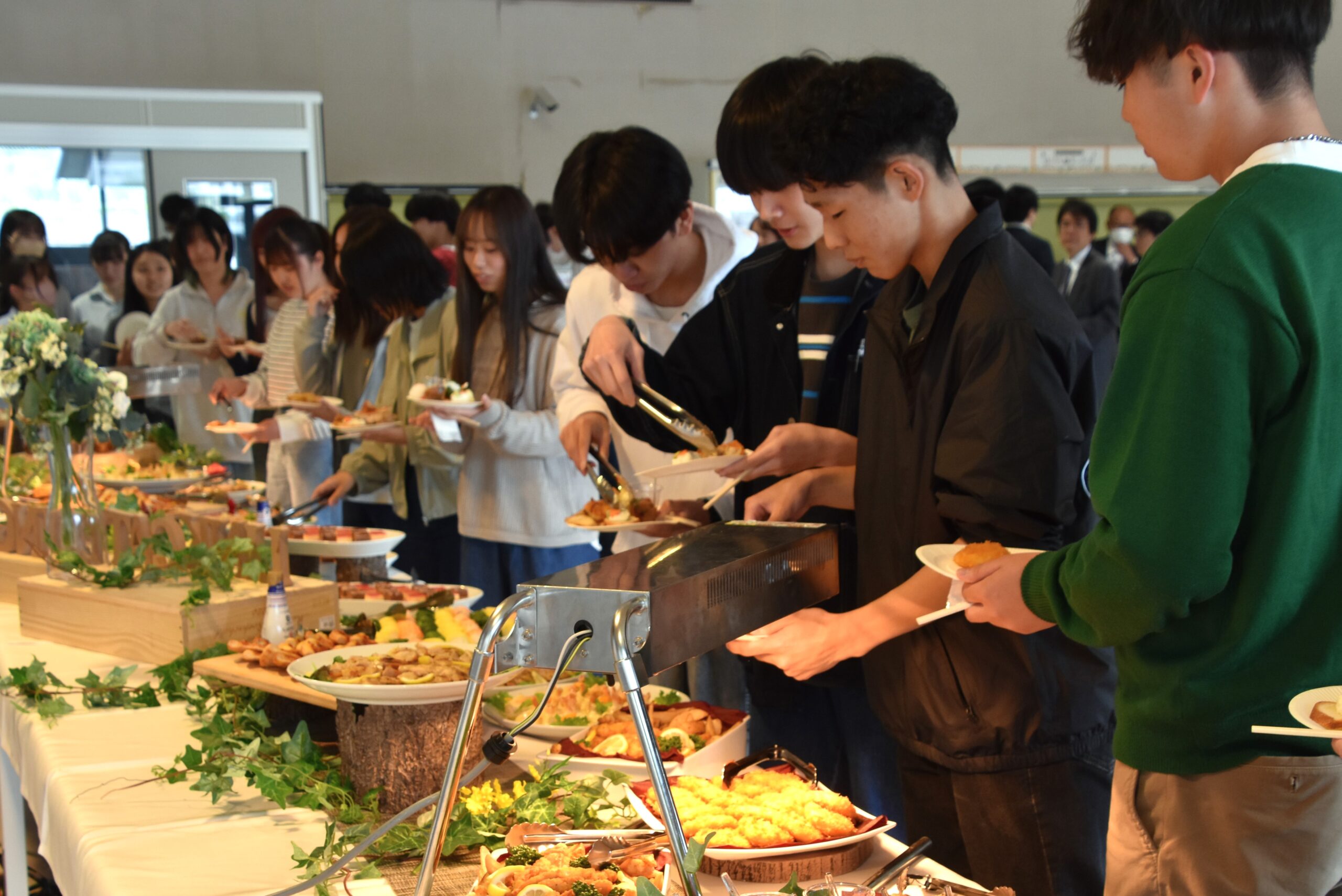 本懇親会は、情報学部に1年生たちが入学して1か月が経過し、履修している講義で関わりのある学生だけではなく、学生同士の交流の機会として、更には教員と気兼ねなく話せるきっかけ作りになればという思いで開催されました。講義では日頃PCに向かって受講している学生たちも、色とりどりにディスプレイされた料理を楽しそうに分け合い、立食形式で仲間たちや教員たちと交流していました。