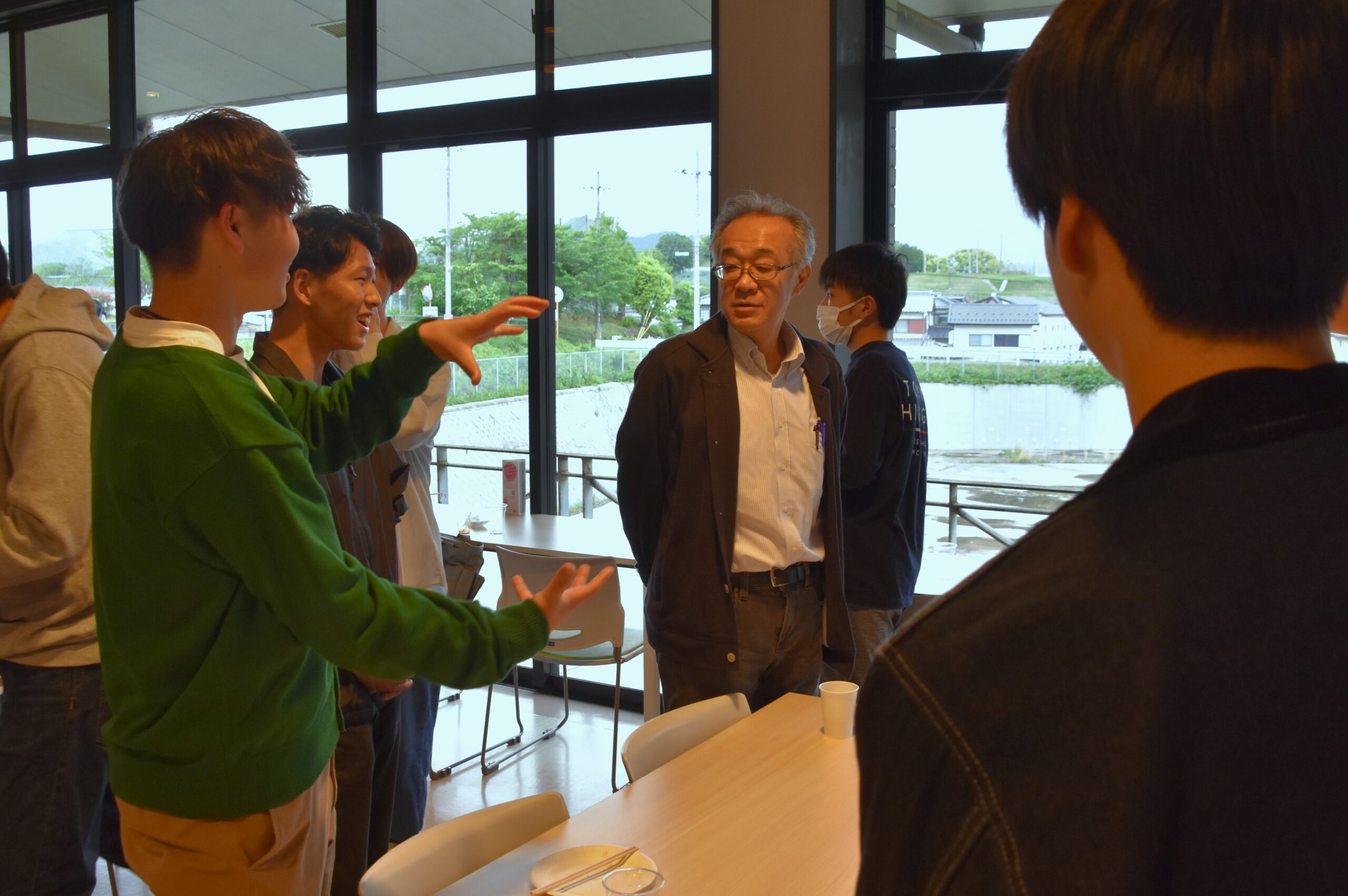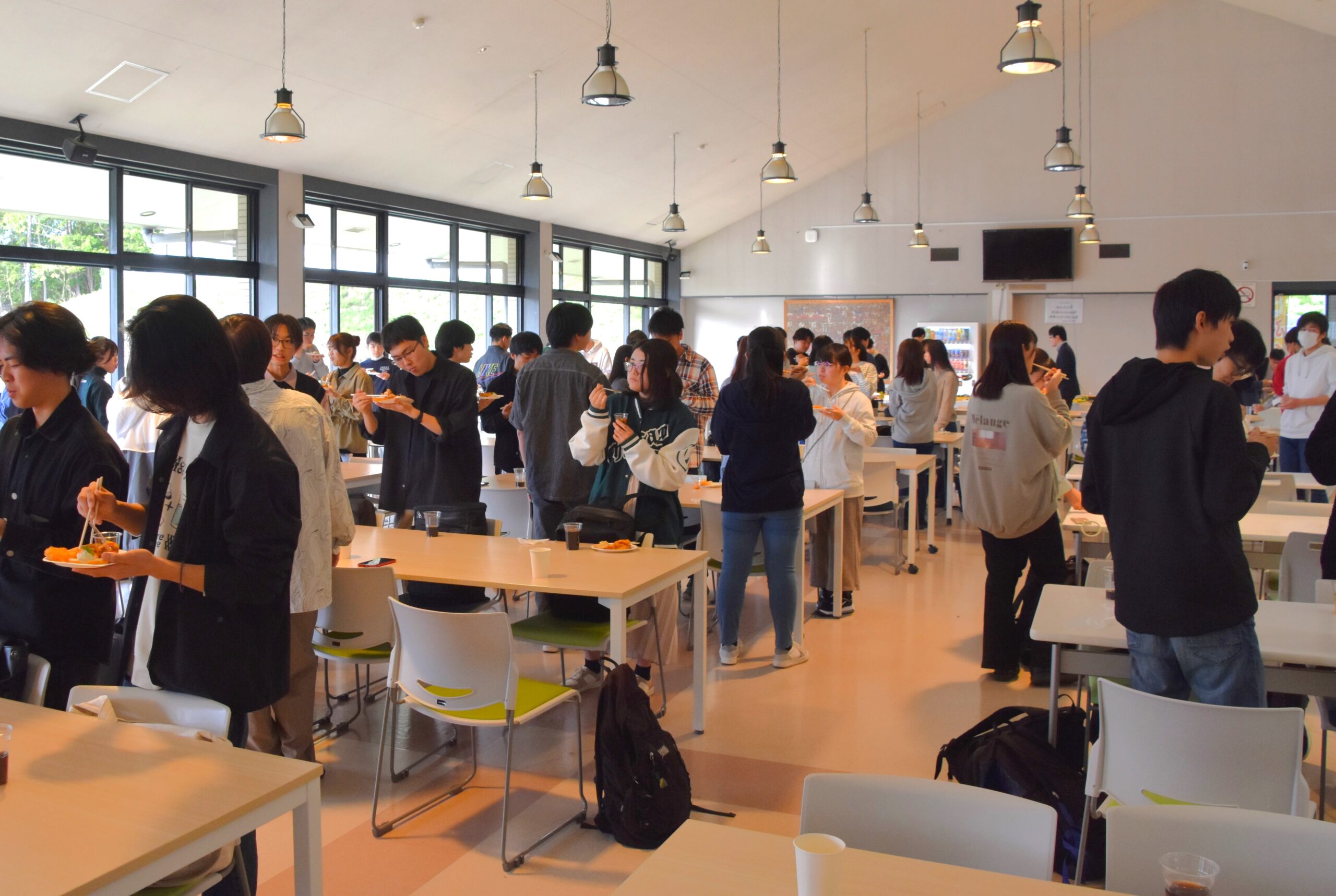 食堂では、「先生はこれまでどんな大学で教えていたのか」「企業で勤めていた時はどんなことをしていたのか」と教員との交流を深める学生や、同じ講義を履修していて今回初めて仲良くなった学生などで、終始賑わいを見せていました。