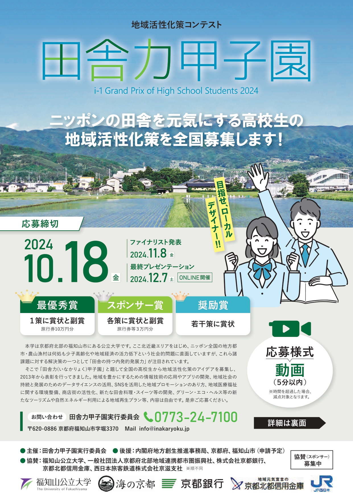 全国の高校生を対象に地域活性化策を募集していますので、募集要項をご確認のうえ、Googleフォームよりエントリーください。皆様からのエントリーをお待ちしております。