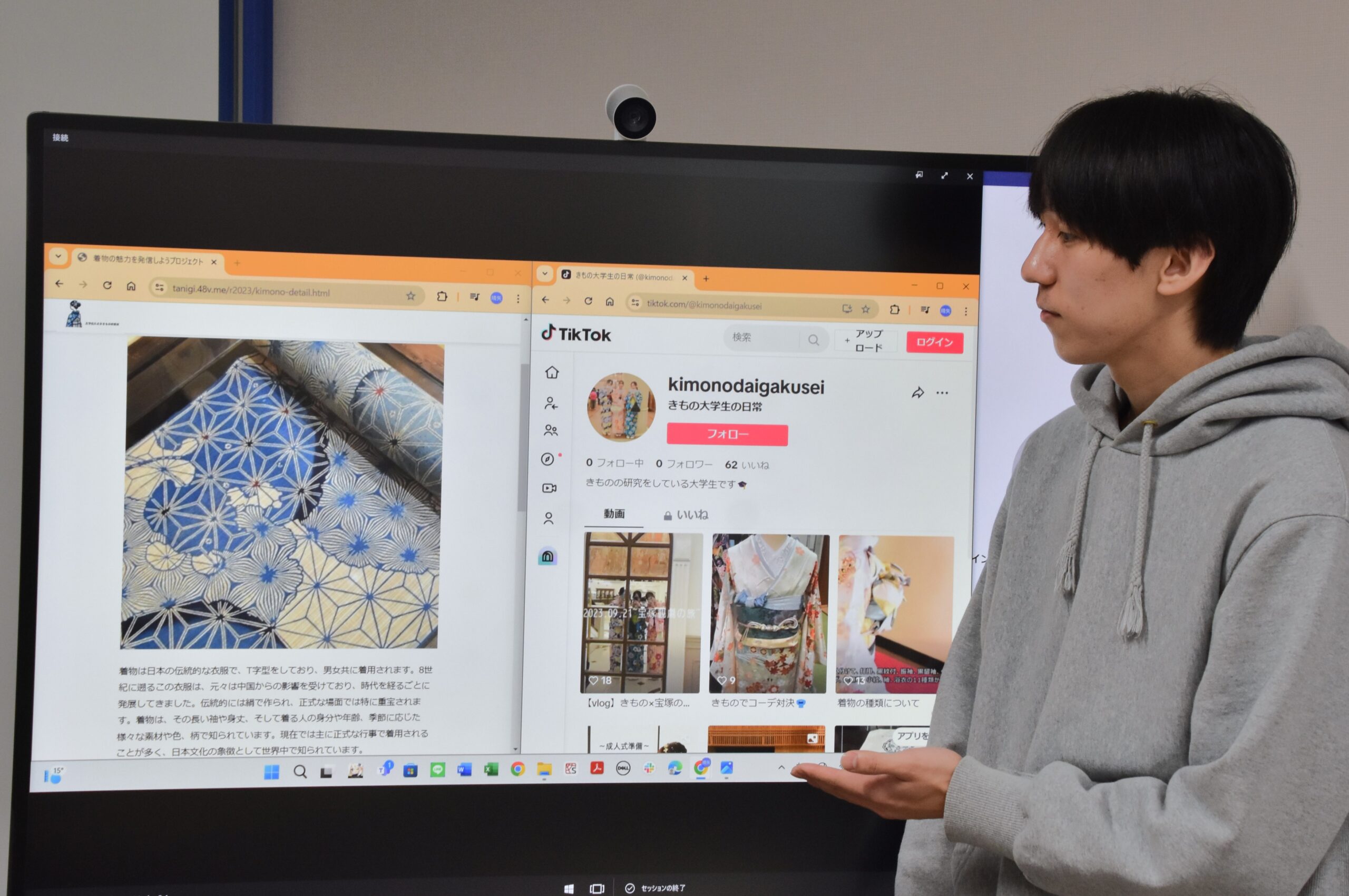 「地域の着物産業活性化を目指す若者の感性を活かしたデザインによる効果的なウェブサイトに関する共同研究」として谷義産業株式会社と崔准教授と同学部・山本吉伸教授のゼミ生たちが約半年間に渡って調査や研究を行い、成果を発表しました。