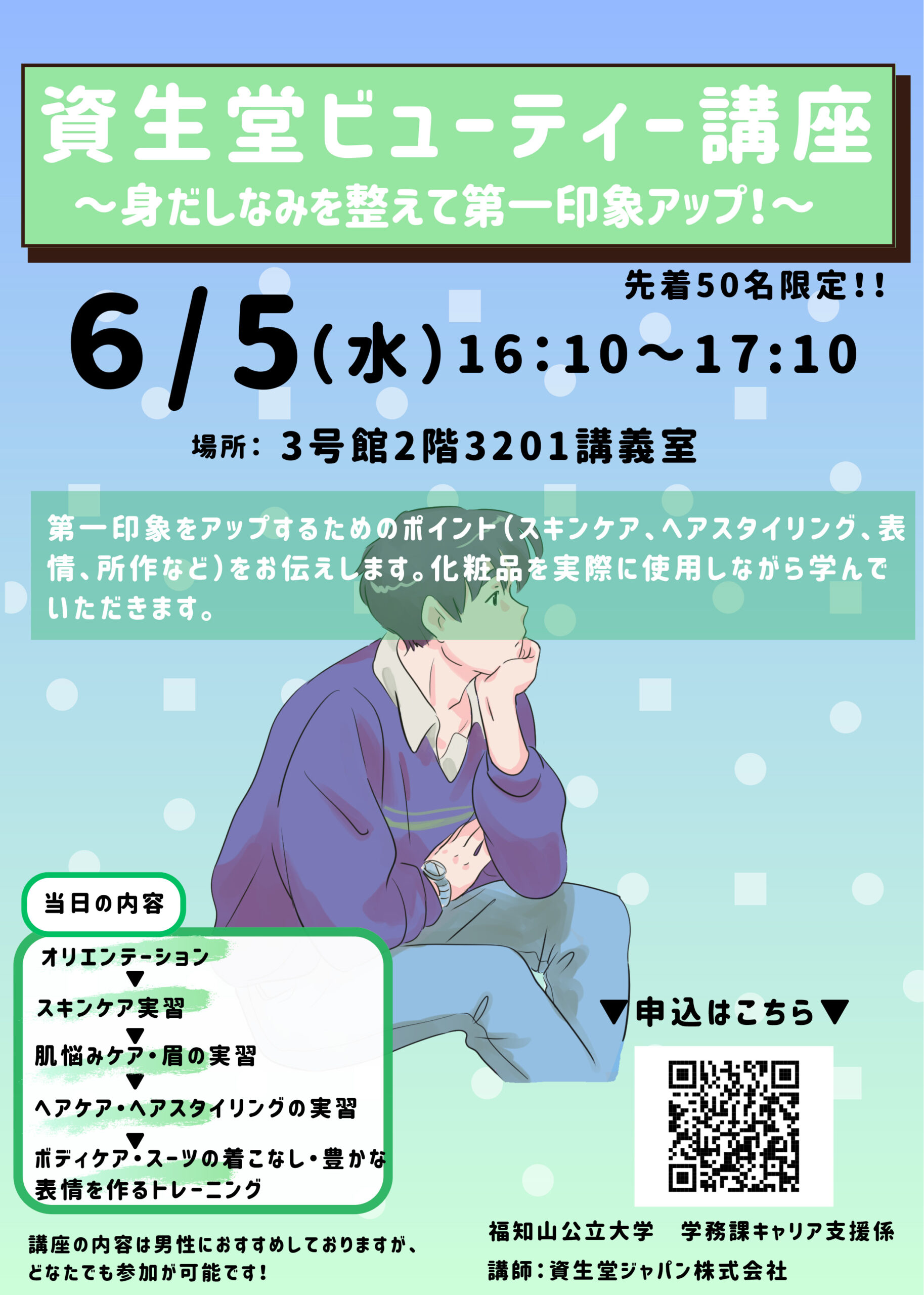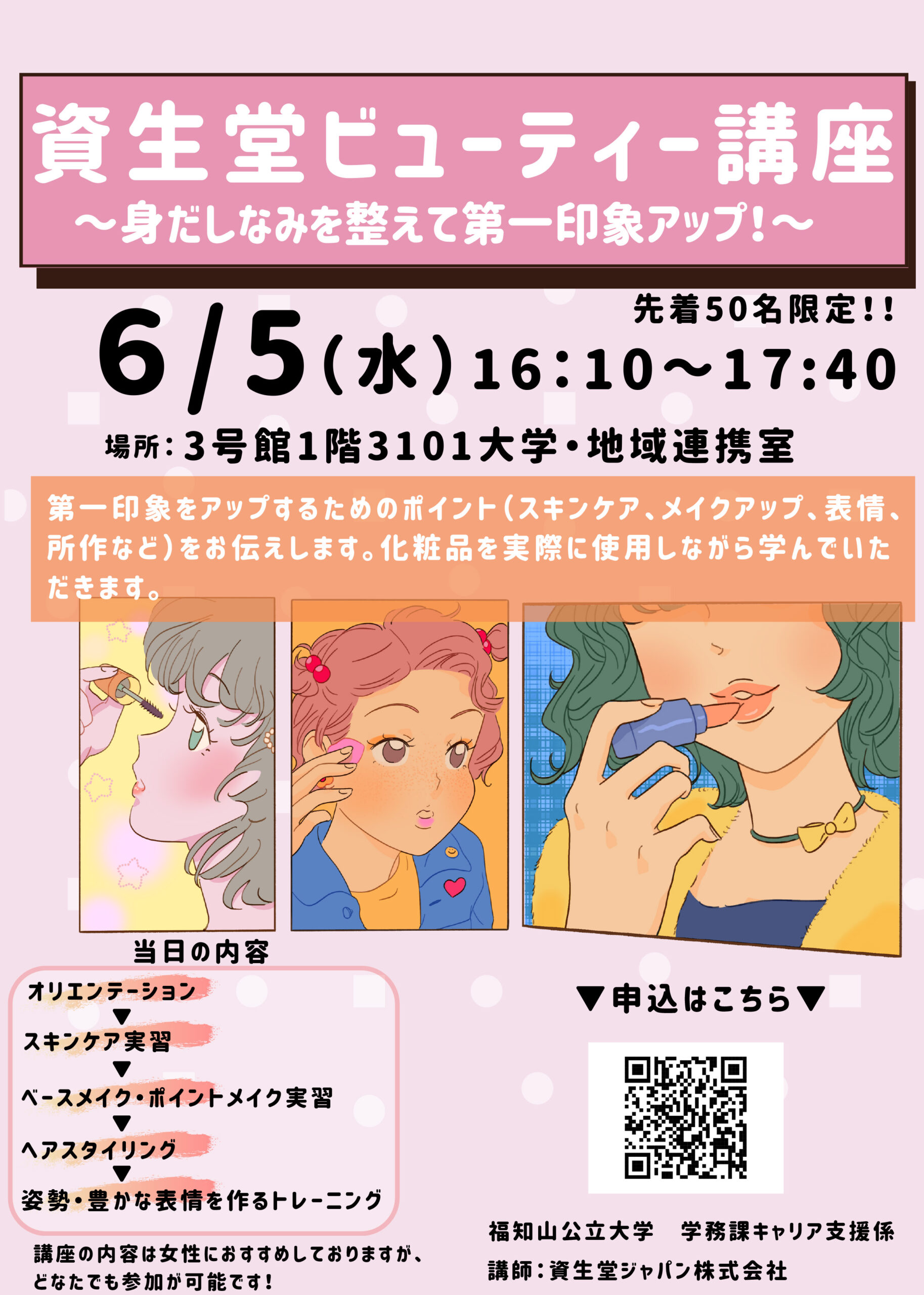 2024年6月5日(水)、資生堂ジャパン株式会社より講師を招聘し、「資生堂ビューティー講座~身だしなみを整えて第一印象アップ!~」を開催します。