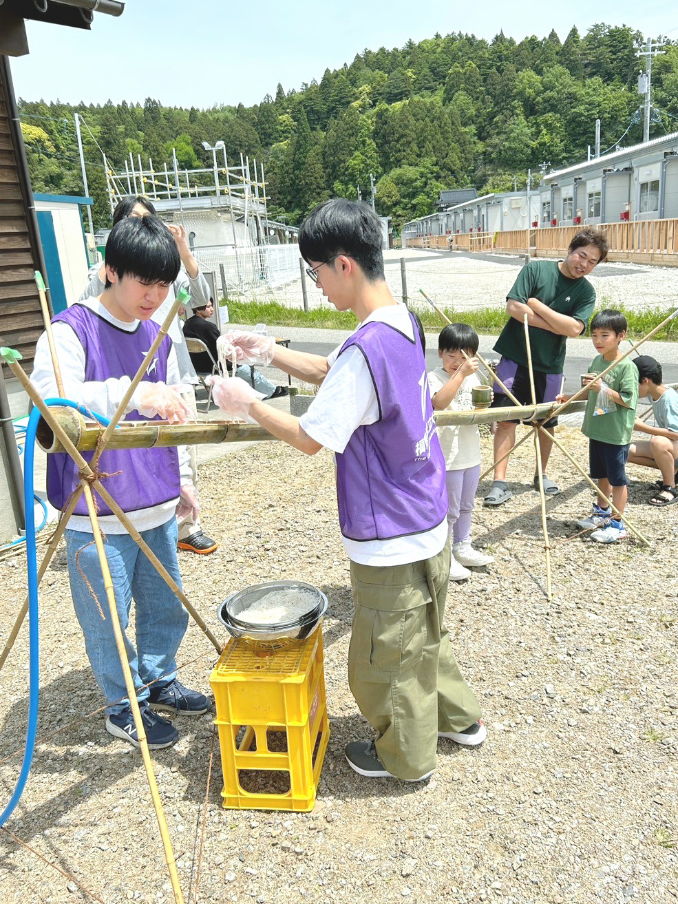 2日目には、仮設住宅や新町地区の住民を対象に交流会を開催しました。流しそうめんの他にスーパーボールすくい、お茶会、くじ引きも行い、お子さん連れなど多くの方に参加していただき、賑やかなイベントとなりました。