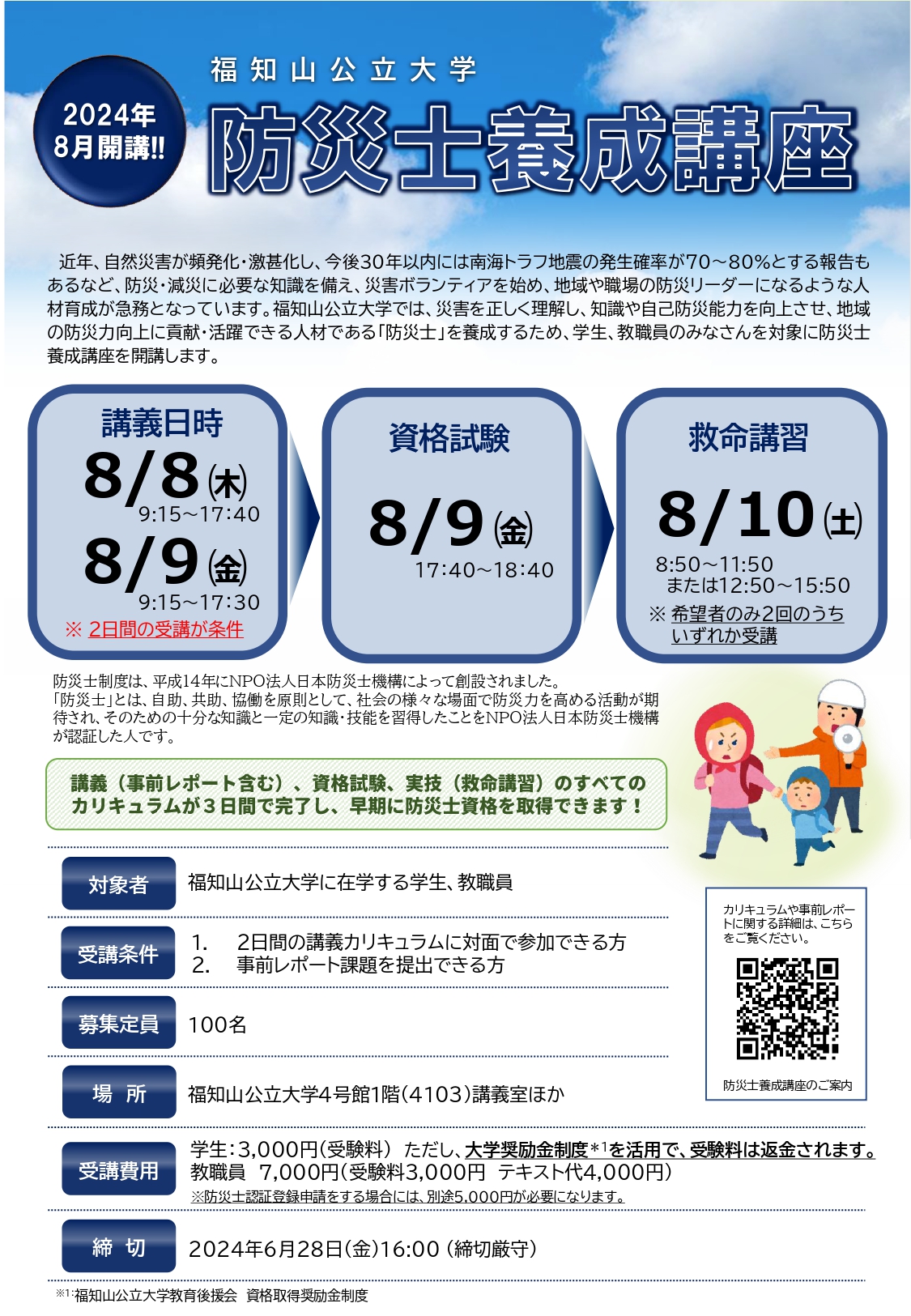 本学では、災害を正しく理解し、知識や自己防災能力を向上させ、地域コミュニティにおいて活躍・貢献できる防災士を養成する講座「2024年度防災士養成講座」を開講します。