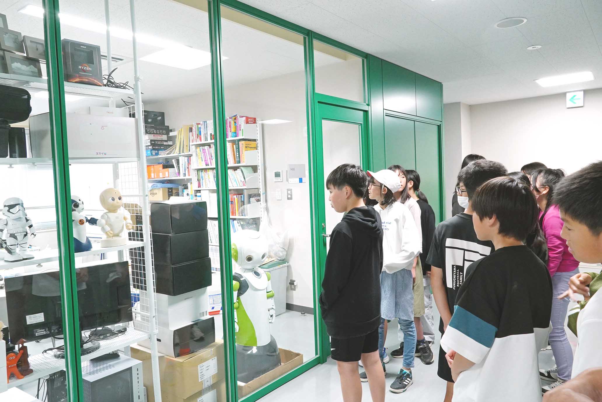 その後2班に分かれ、講義室や事務局、PC演習室などといった1号館・4号館の各施設を回りました。ロボットの並ぶ研究室や、小学校の図書館とは違った雰囲気のメディアセンターでは、特に関心を持って見学された様子でした。