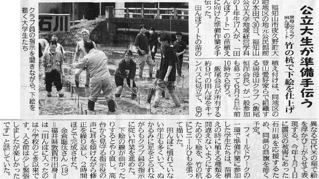 両丹日日新聞(2024年5月31日付け)に、地域経営学部の演習科目「地域経営演習I-B」(担当:神谷 達夫教授、中尾 誠二教授)の一環で、学生が参加した「田んぼアート」(主催:居母山クラブ)の事前準備の様子が紹介されました。