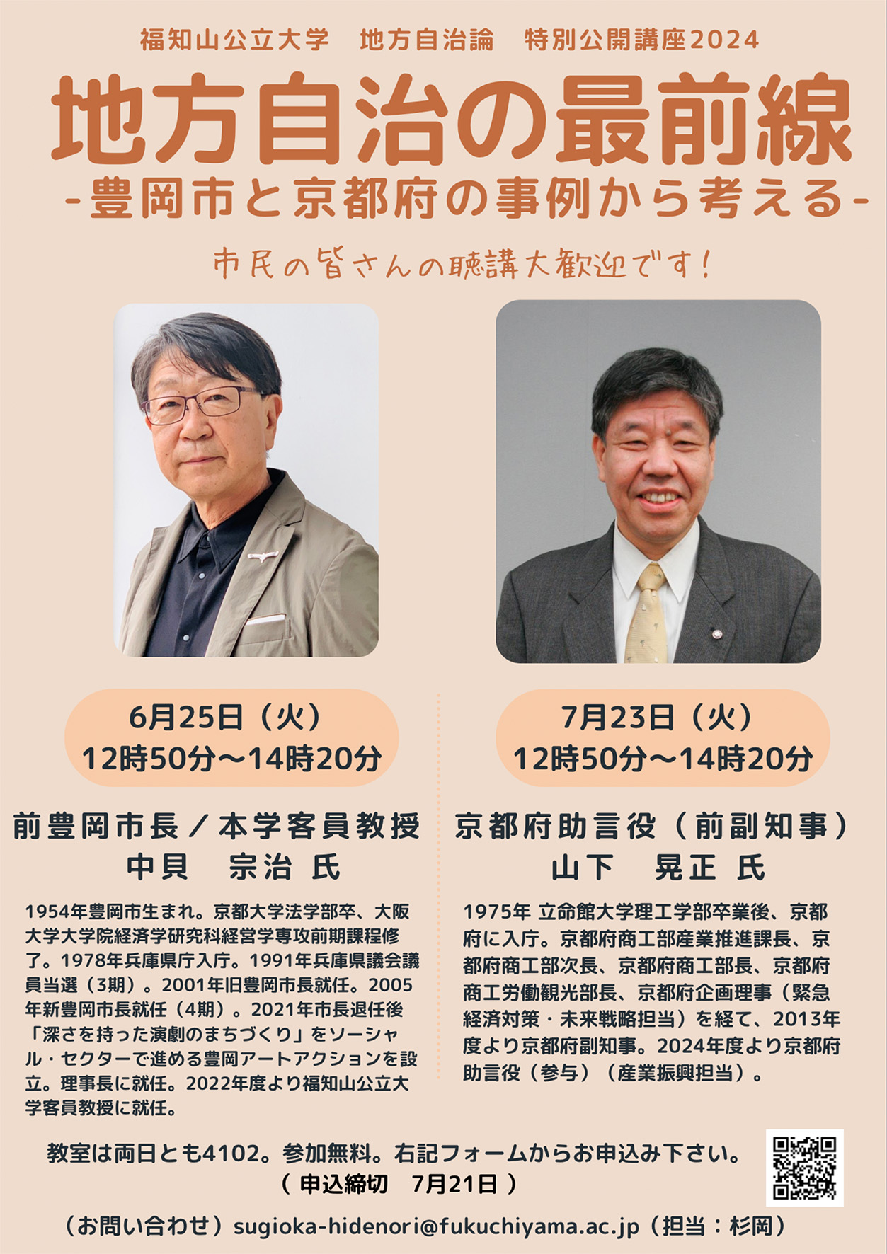 2024年6月25日(火)・7月23日(火)、地域経営学部の講義「地方自治論」(担当:杉岡秀紀准教授)の一環で、前豊岡市長の中貝宗治氏と前京都府副知事の山下晃正氏をゲストスピーカーに招聘し、特別公開講座「地方自治の最前線-豊岡市と京都府の事例から考える-」を本学で開催します。関心のある方はどなたでも受講可能ですので、是非ご参加ください。