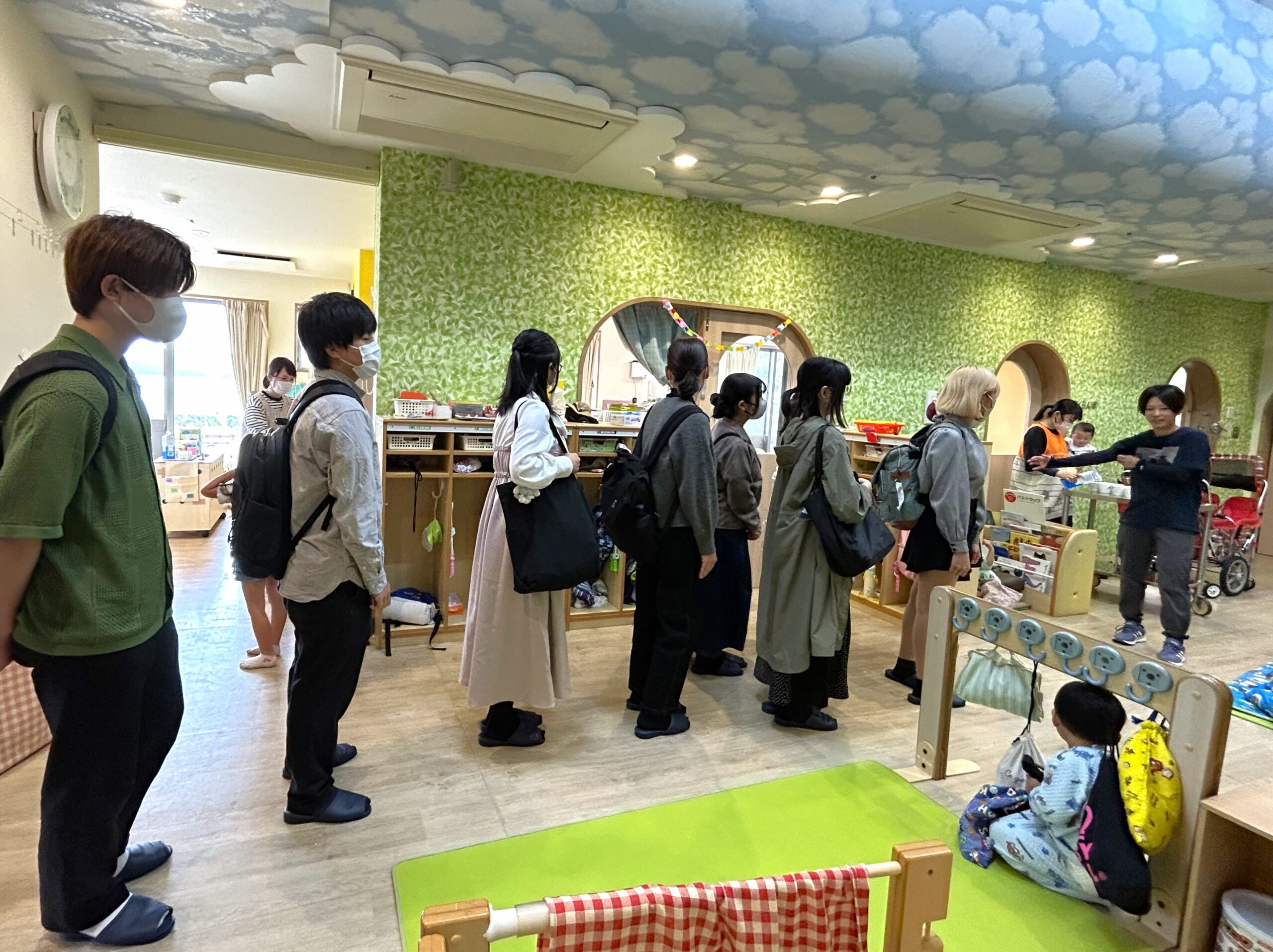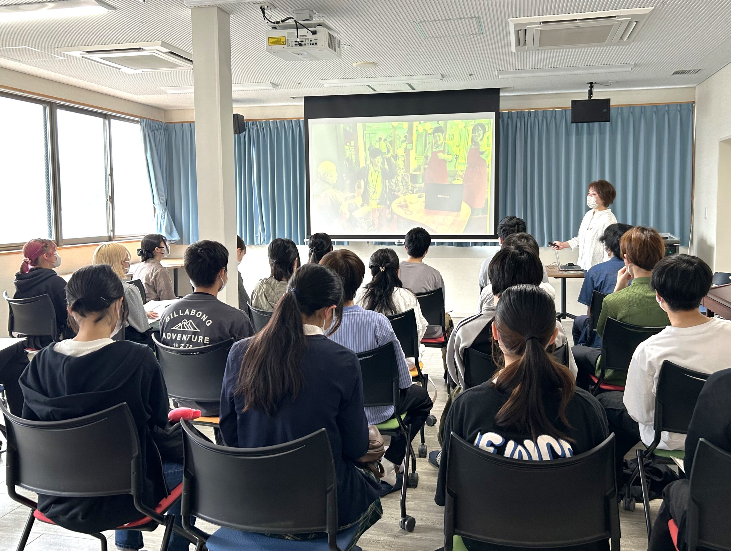 特別養護老人ホームの稲穂三和子施設長より、みねやま福祉会の成り立ちや、「マ・ルート」の概要などの講話を聞いた後、施設を見学し、学生たちは保育園の児童たちと天橋立の見えるデッキで交流しました。
