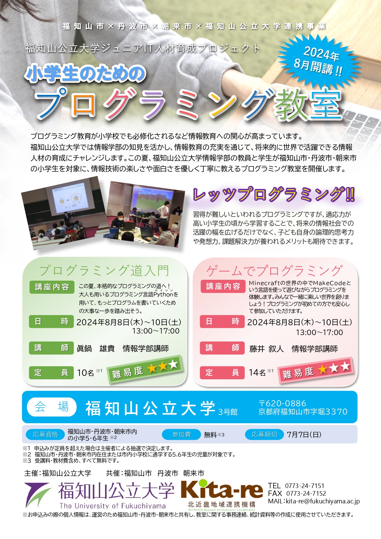 プログラミング教育が小学校でも必修化されるなど情報教育への関心が高まっています。本学では情報学部の知見を活かし、情報教育の充実を通じて、将来的に世界で活躍できる情報人材の育成にチャレンジします。この夏、本学情報学部の教員と学生が福知山市・丹波市・朝来市の小学生を対象に、情報技術の楽しさや面白さを優しく丁寧に教えるプログラミング教室を開催します。