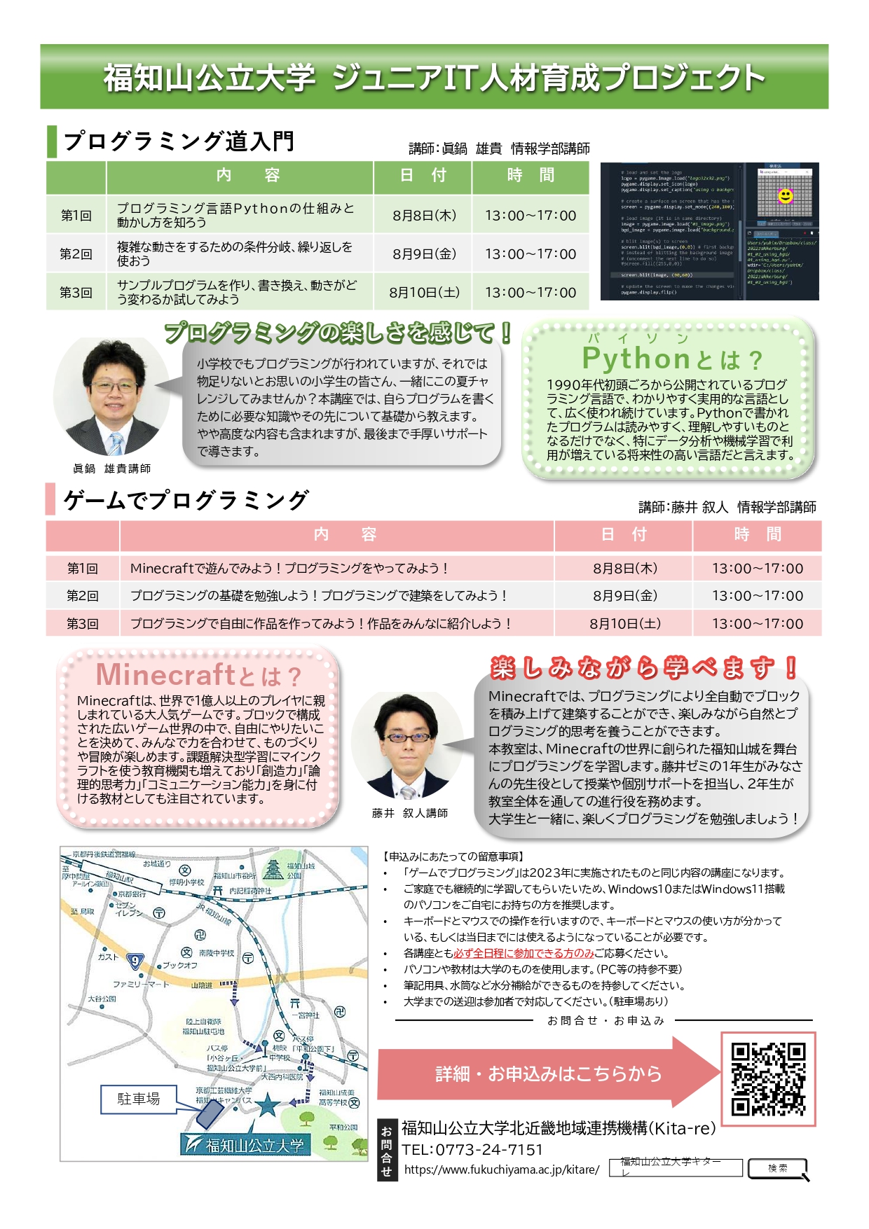 - 講座内容:この夏、本格的なプログラミングの道へ!大人も用いるプログラミング言語Pythonを用いて、もっとプログラムを書いていくための大事な一歩を踏み出そう。