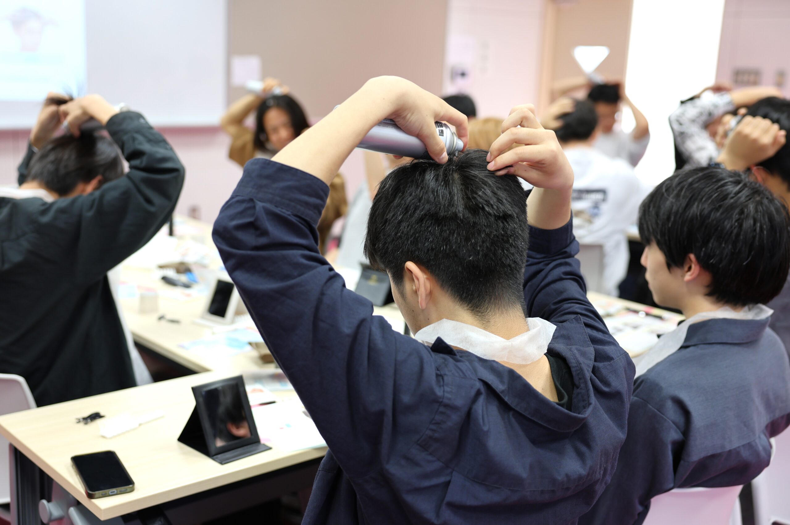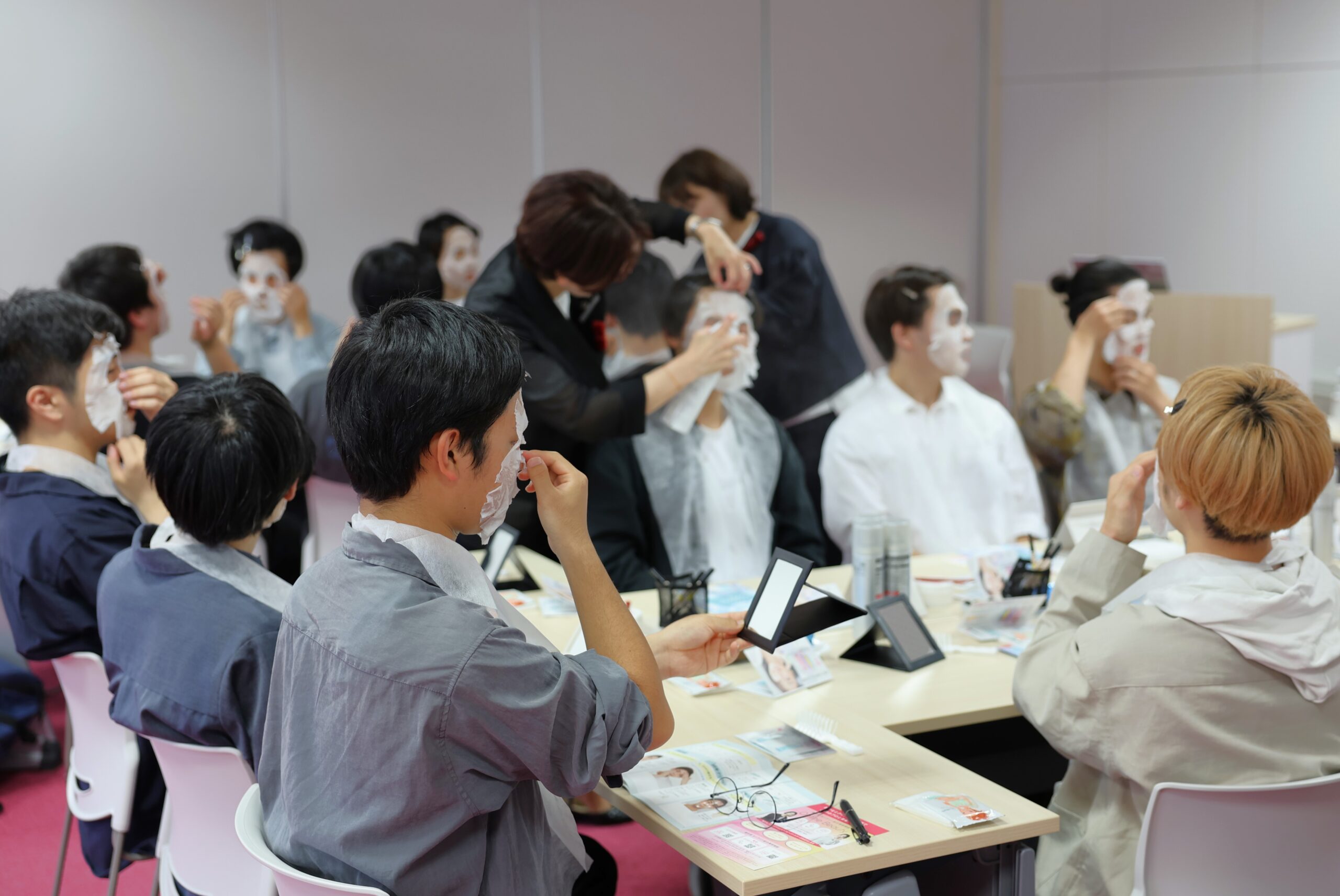 「メンズフレッシャーズコース 就活編」に参加した23名は、男性と女性の皮脂量の違いや洗顔の回数、肌が受ける紫外線の影響などについて説明がありました。「スキンケア」では洗顔シートで顔全体の油脂汚れを落とした後、学生たちはフェイスパックの扱いに苦戦しながら保湿を行い、仕上げにBBクリームを塗ると表情が晴れやかになりました。「ヘアケア・スタイリング」では、パチパチと泡がはじける薬用スカルプトニックのスプレーで地肌をマッサージし、就職活動を行う際のスタイリングにおける注意点などを学びました。