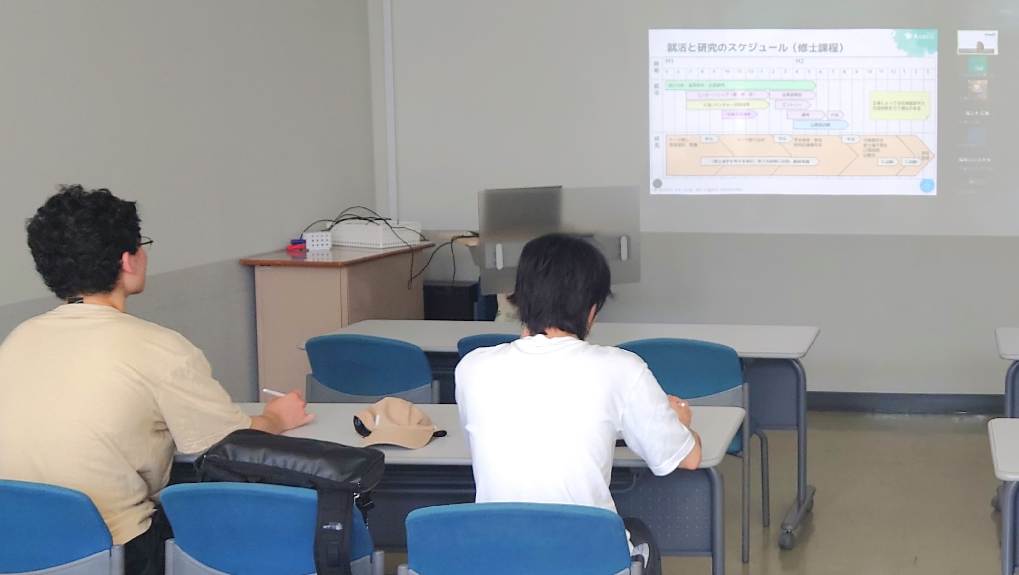 本ガイダンスは、今年4月に開設した大学院に在籍している学生を対象に、学部生とのキャリアパスの違いや大学院課程における就職活動のスケジュール、研究との両立など、大学院生ならではの視点からキャリアを取り巻く環境について、株式会社アカリク プロジェクト開発グループ 浅岡凜氏に講演いただき、当日はオンライン参加も含めて8名が参加しました。