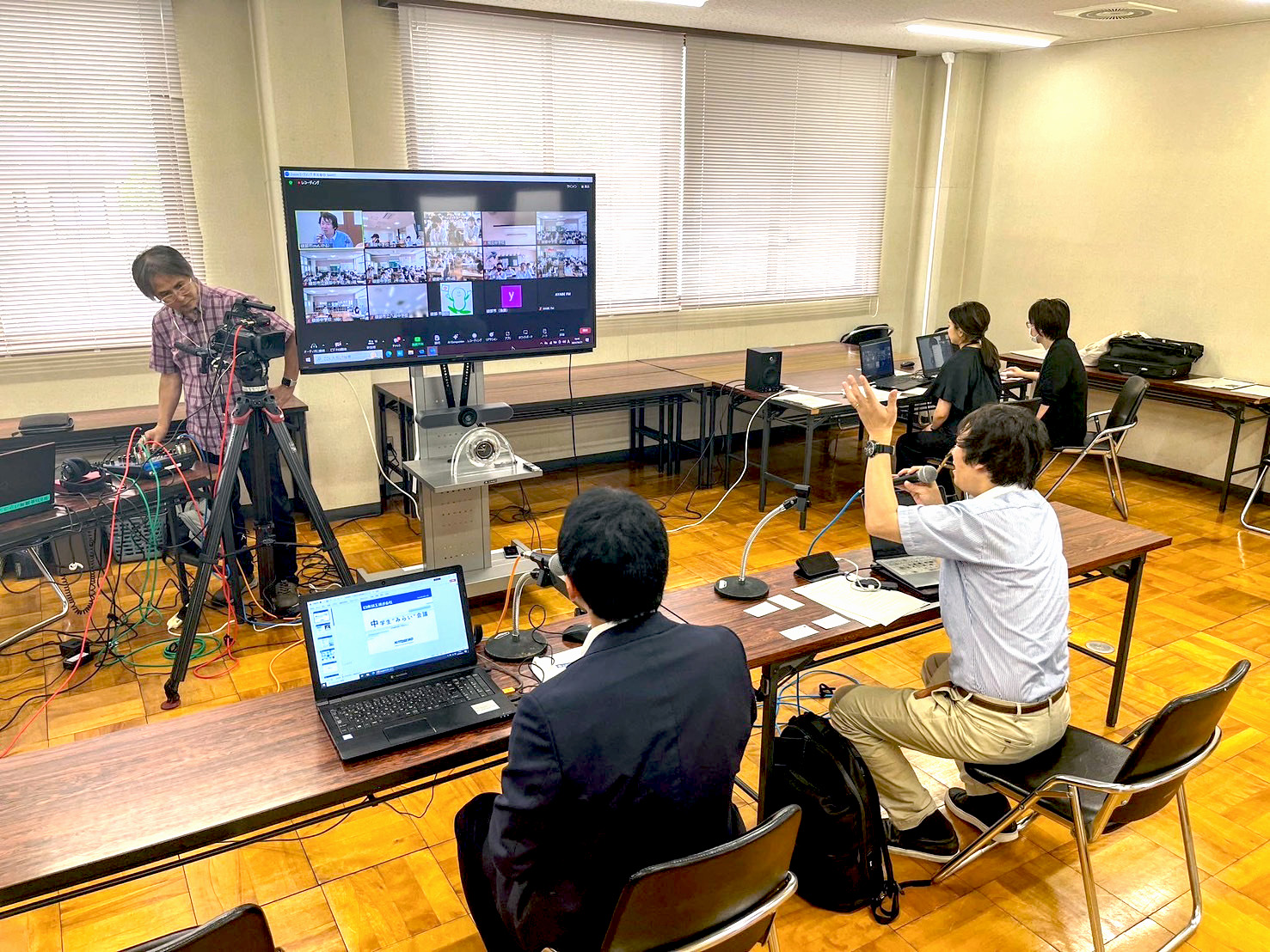 会議冒頭は、山崎善也綾部市長による開会挨拶の後、杉岡准教授による進行のもと、前半は綾部市にUターンされた日東精工株式会社人事課の白波瀬智久さん、Iターンされた古民家レンタルスペースHIKARI副代表の古割大地さんによる話題提供があり、オンラインでつながった中学校と質疑応答を行いました。後半は、白波瀬さん、古割さん、杉岡准教授による鼎談があり、閉会しました。
