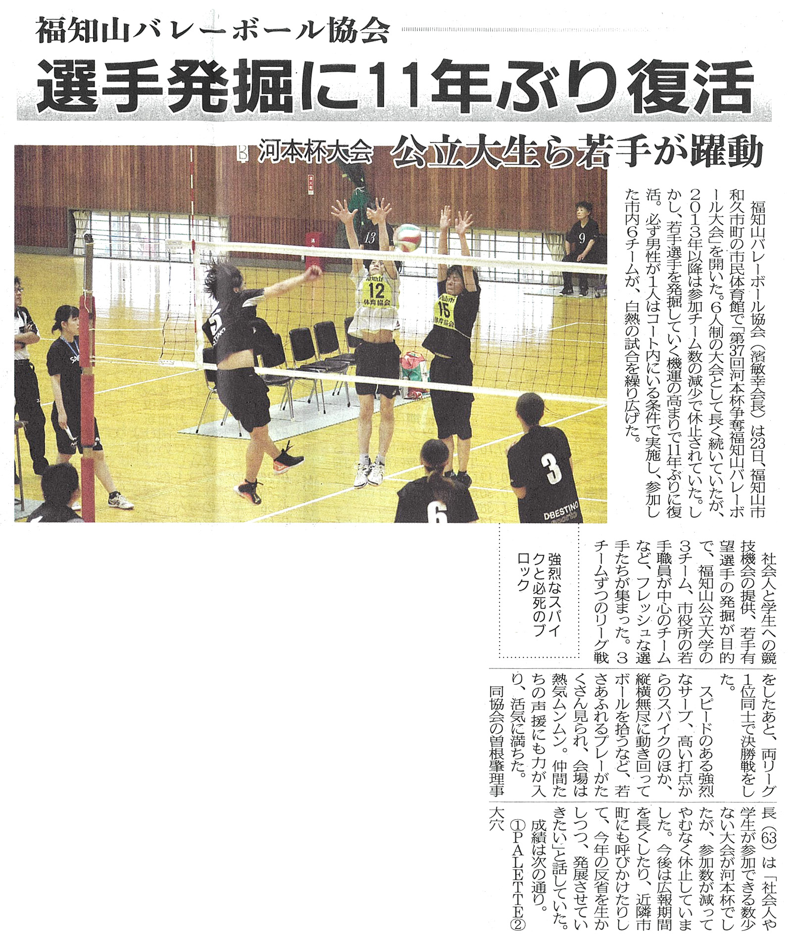 - 両丹日日新聞 2024年6月24日(月)1面「福知山バレーボール協会 選手発掘に11年ぶり復活 河本杯大会 公立大生ら若手が躍動」
