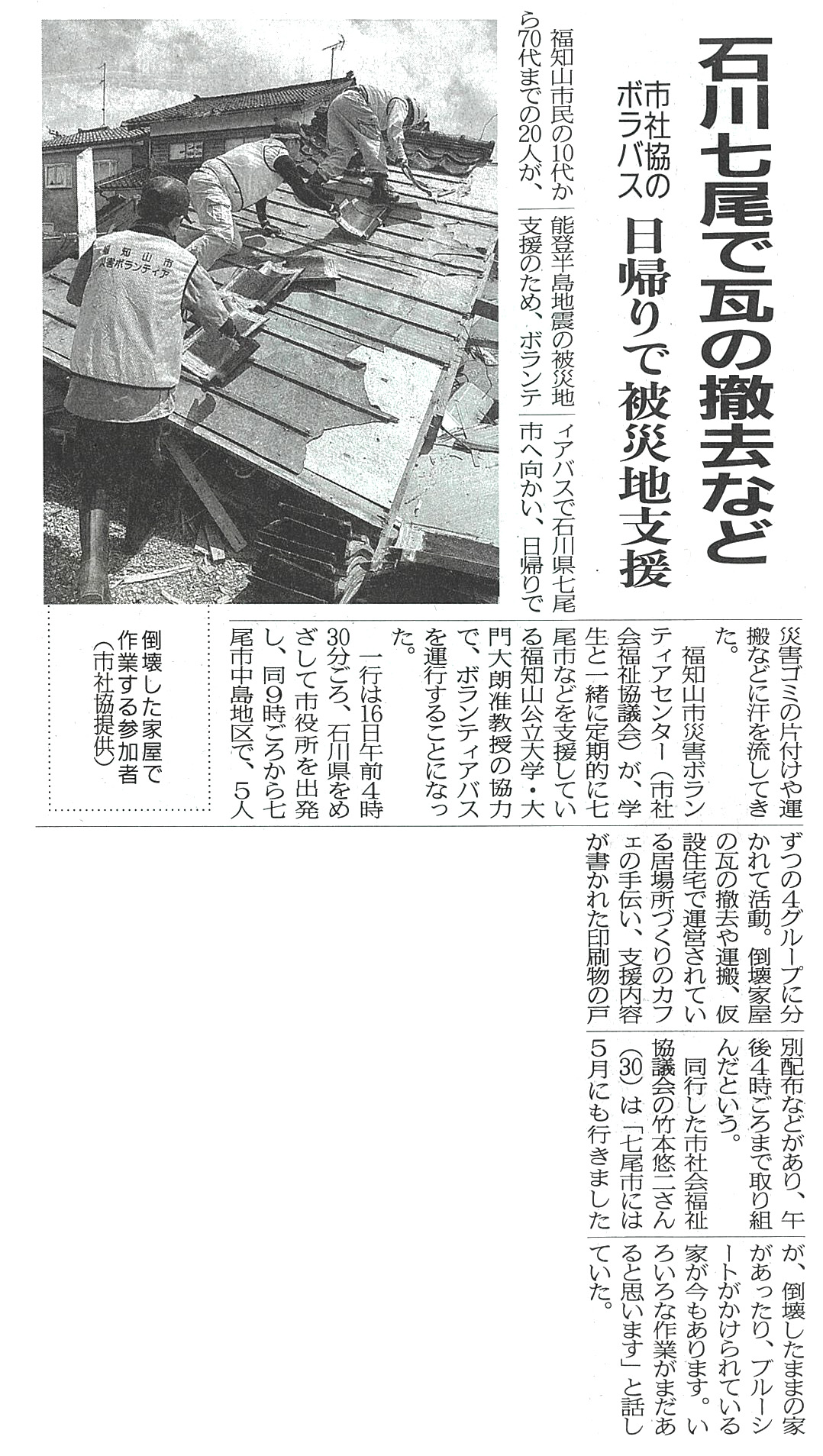 - 両丹日日新聞 2024年6月24日(月)3面「石川七尾で瓦の撤去など 市社協のボラバス日帰りで被災地支援」