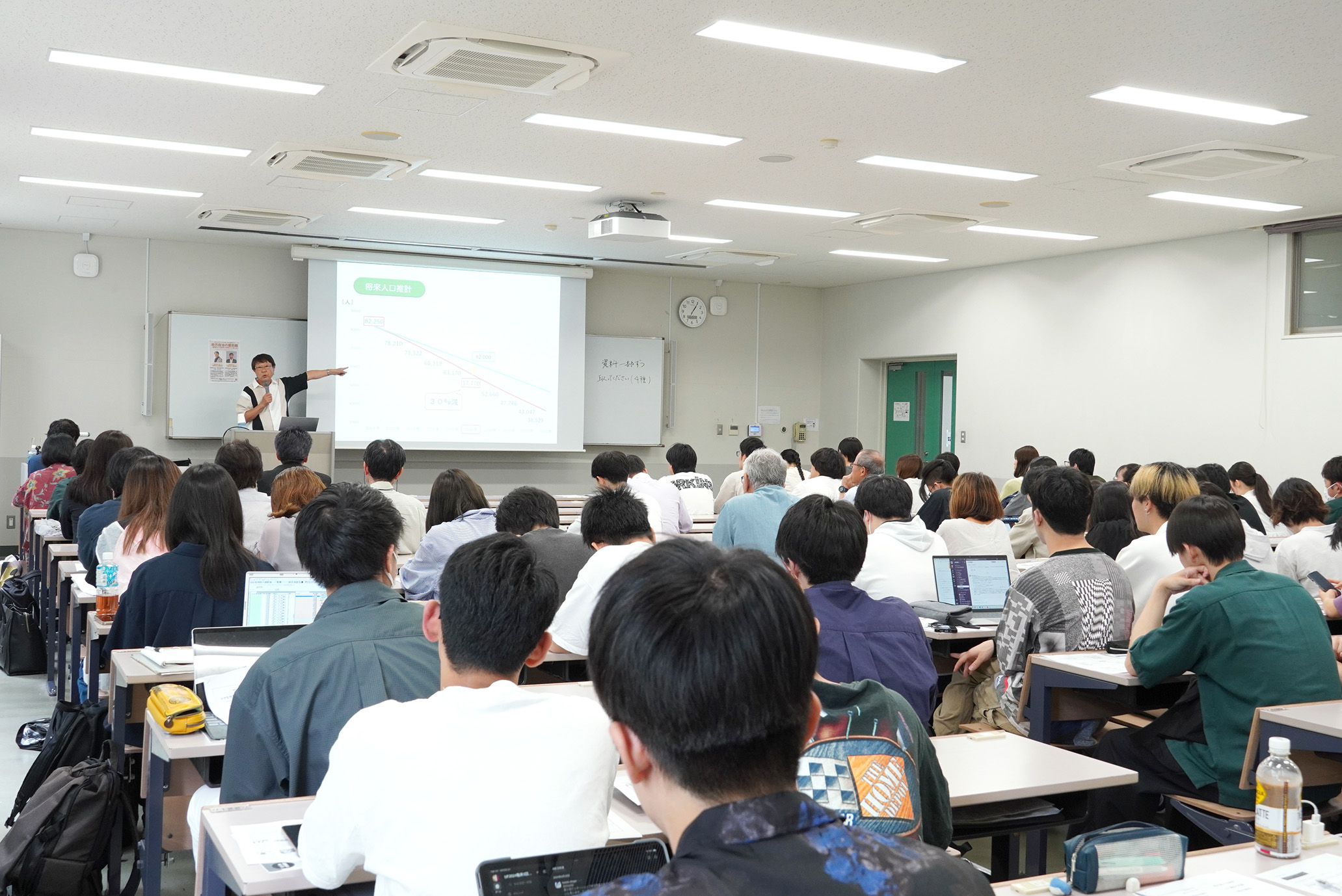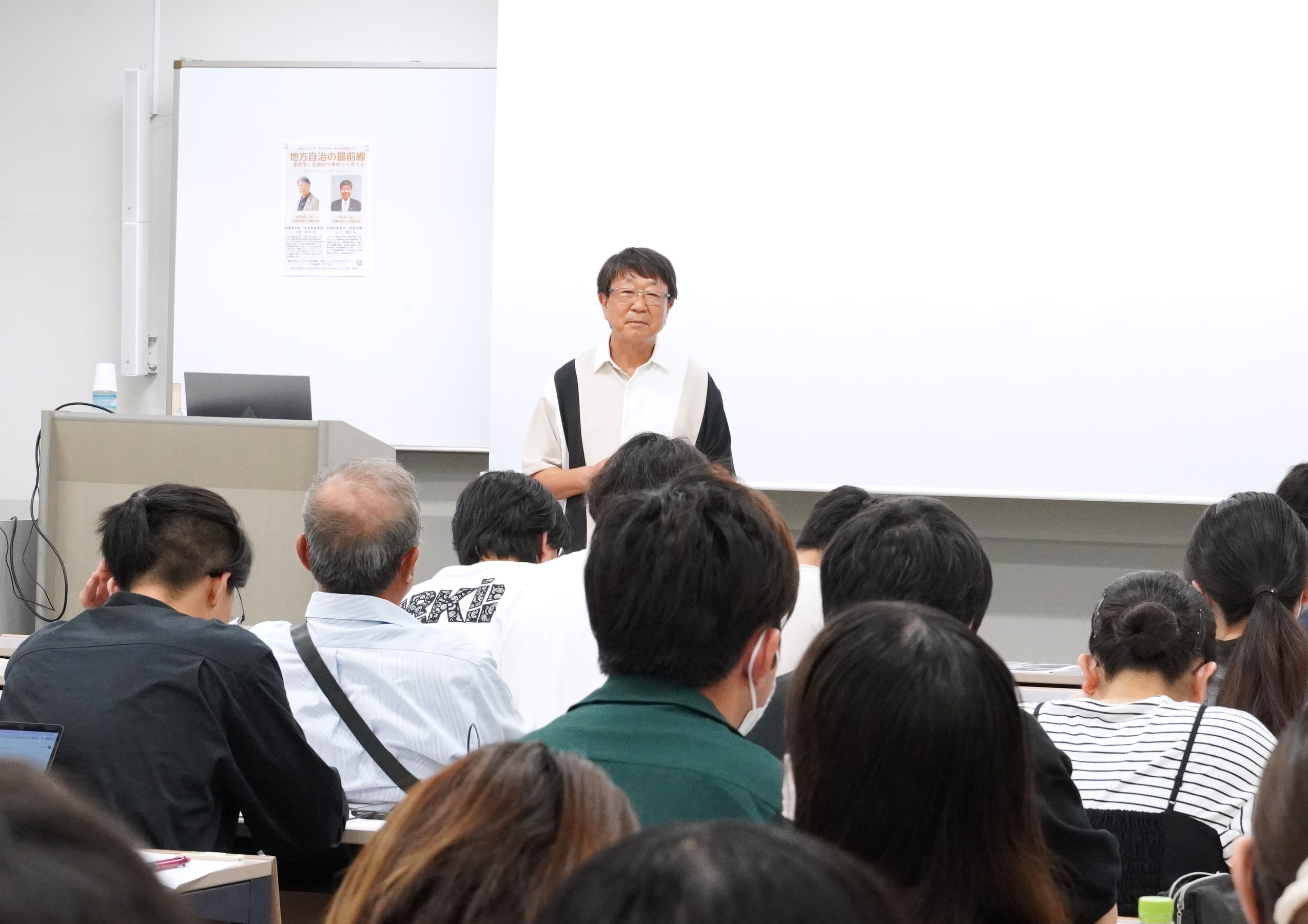 2024年6月25日(火)、地域経営学部の講義「地方自治論」(担当:杉岡秀紀准教授)の一環として、特別公開講座「地方自治の最前線-豊岡市と京都府の事例から考える-」を本学で開催し、前豊岡市長の中貝宗治氏(本学客員教授)をゲストスピーカーに招聘しました。