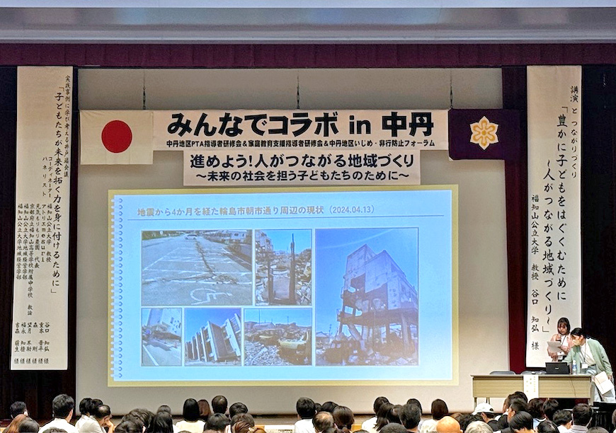2024年6月22日(土)に、「みんなでコラボin中丹」(中丹地区PTA指導者研修会、家庭教育支援指導者研修会、中丹地区いじめ・非行防止フォーラム)が舞鶴市中総合会館で開催され、地域経営学部・谷口知弘教授と本学学生が登壇しました。