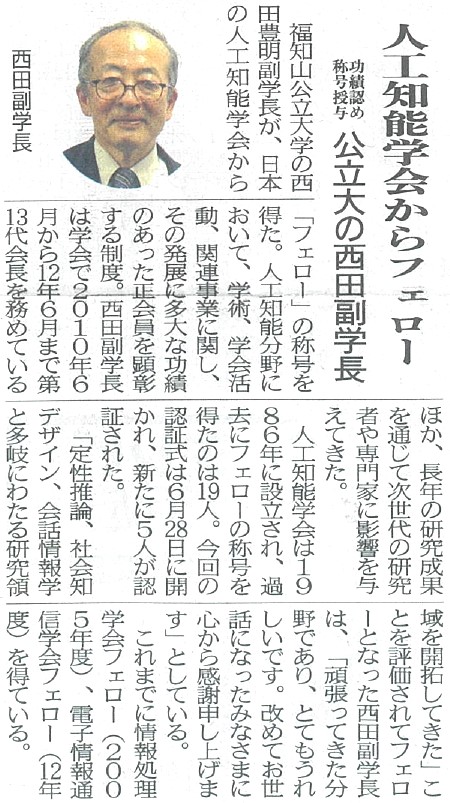 ・両丹日日新聞 2024年7月3日(水)1面「人工知能学会からフェロー 功績認め称号授与 公立大の西田副学長」