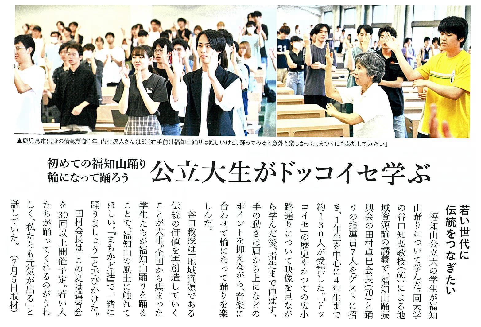 毎日新聞 2024年7月10日(水)朝刊19面【郷土芸能で風土に触れて 福知山公立大生ら踊り学ぶ ドッコイセまつり】