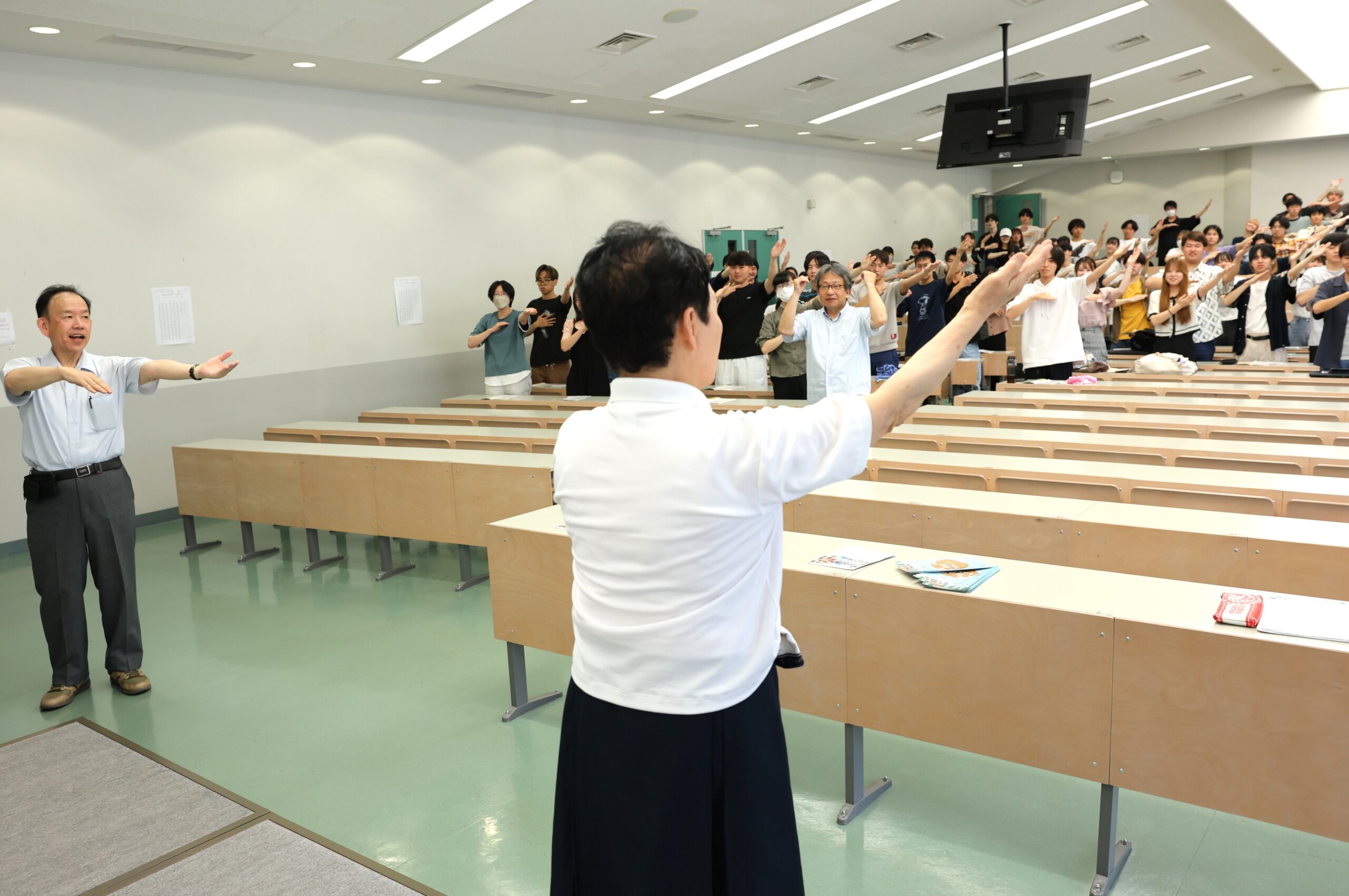 2024年7月5日(金)、講義科目「地域資源論」(担当:地域経営学部・谷口知弘教授)では、福知山踊振興会の田村卓巳会長と踊りの指導者7名をゲストに招き、福知山踊りについて学びました。