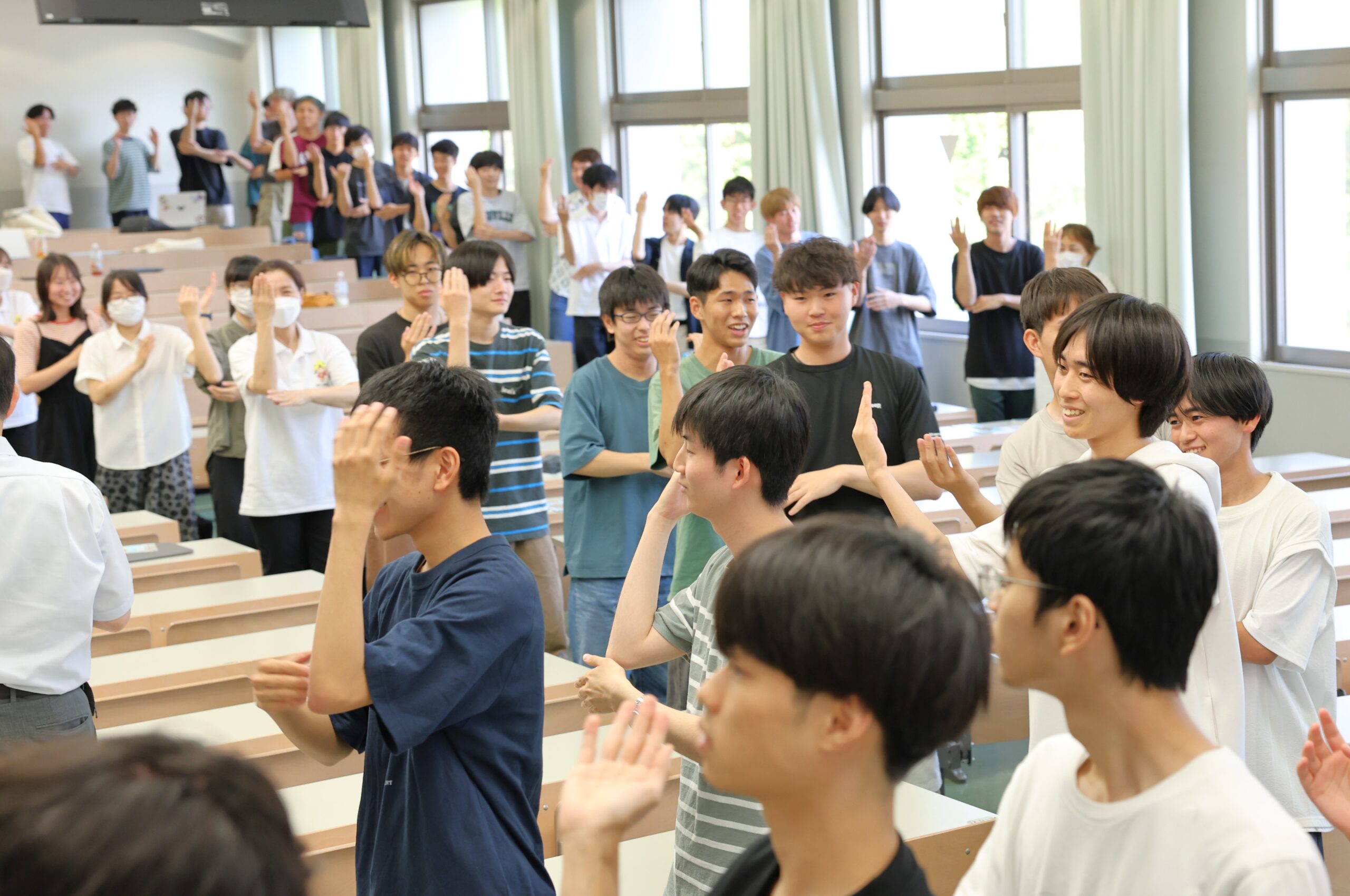 その後、実際に福知山踊りの振り付け指導があり、「指先までしっかり伸ばす」「手を叩く仕草は顔の前で」「手の動きは肩から上に」「声を出して歌いながら」などのポイントを伝え、16手数を1つずつ学びました。最後には全員が教室いっぱいに大きな2つの円を描くように広がり、音楽に合わせて踊りを楽しみました。