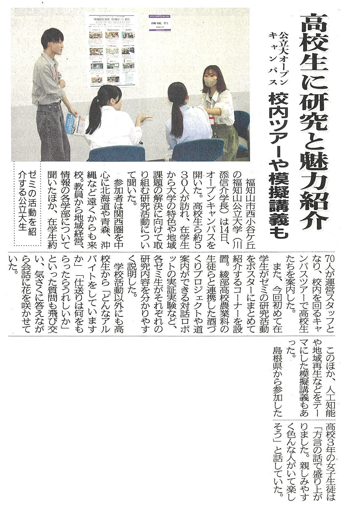 - 両丹日日新聞 2024年7月16日(火)1面「高校生に研究と魅力紹介 公立大オープンキャンパス校内ツアーや模擬講義も」