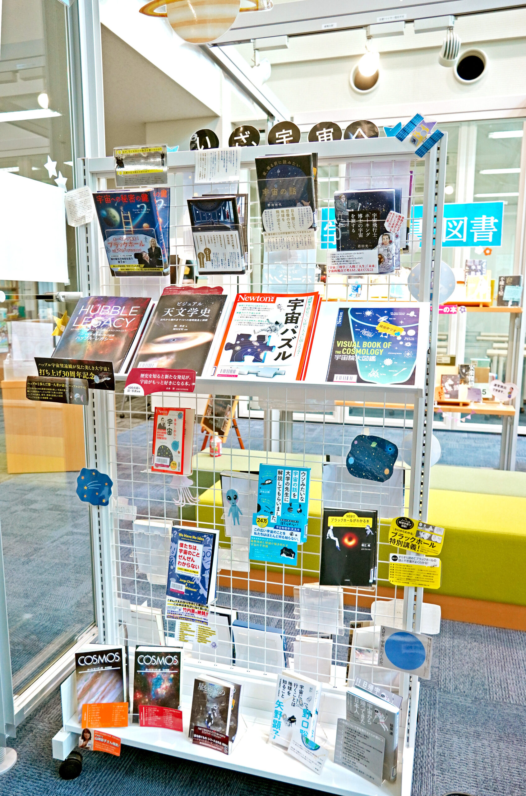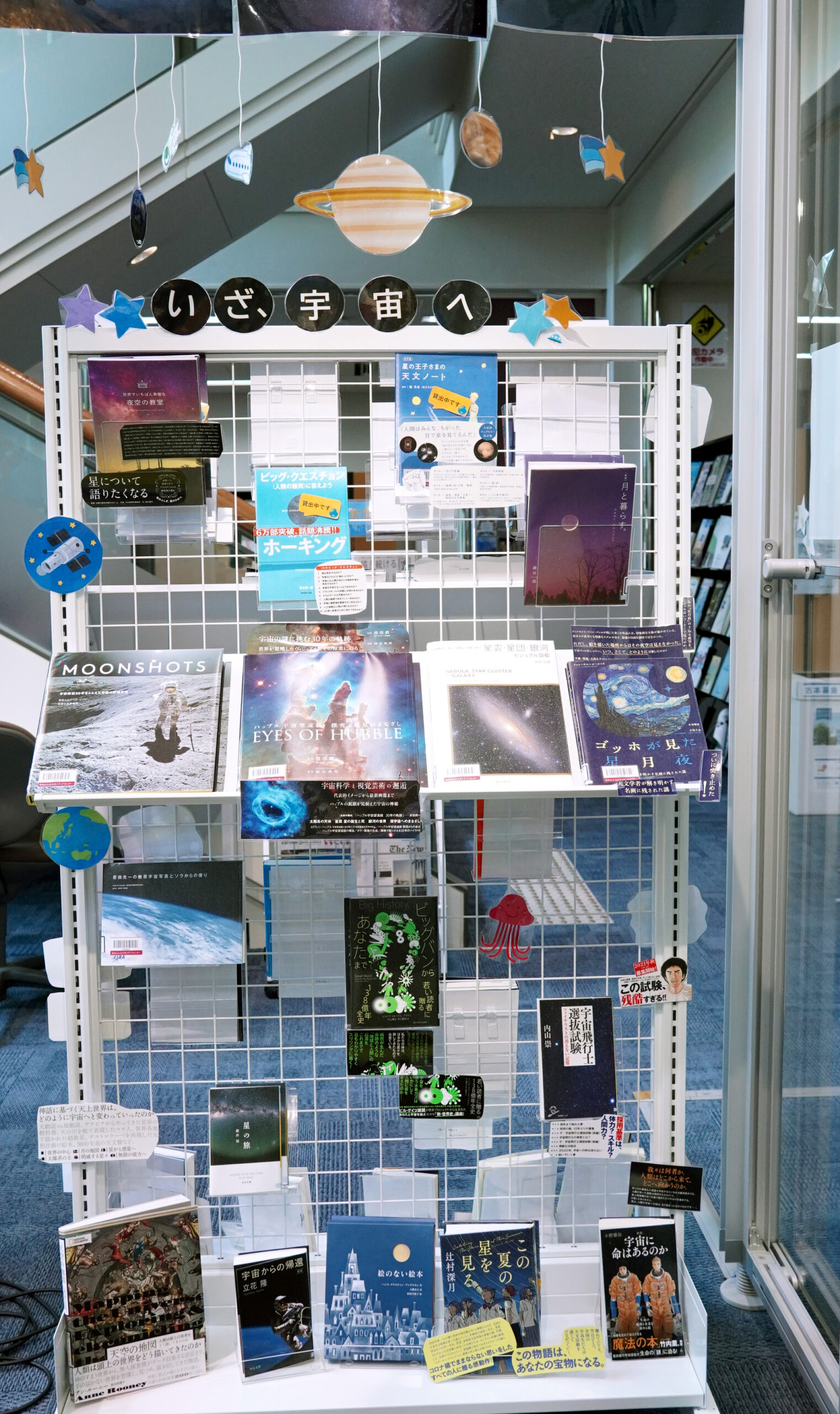 本学メディアセンターでは、企画展示「きらめく星、宇宙を探る!!」と題し、天文学や宇宙論の専門的な書籍から、宇宙望遠鏡が記録した美しい宇宙の写真集、星を題材とした絵本や小説まで、幅広いジャンルの本を展示しています。一般の図書と同様に貸出も行っていますので、是非お立ち寄りください。