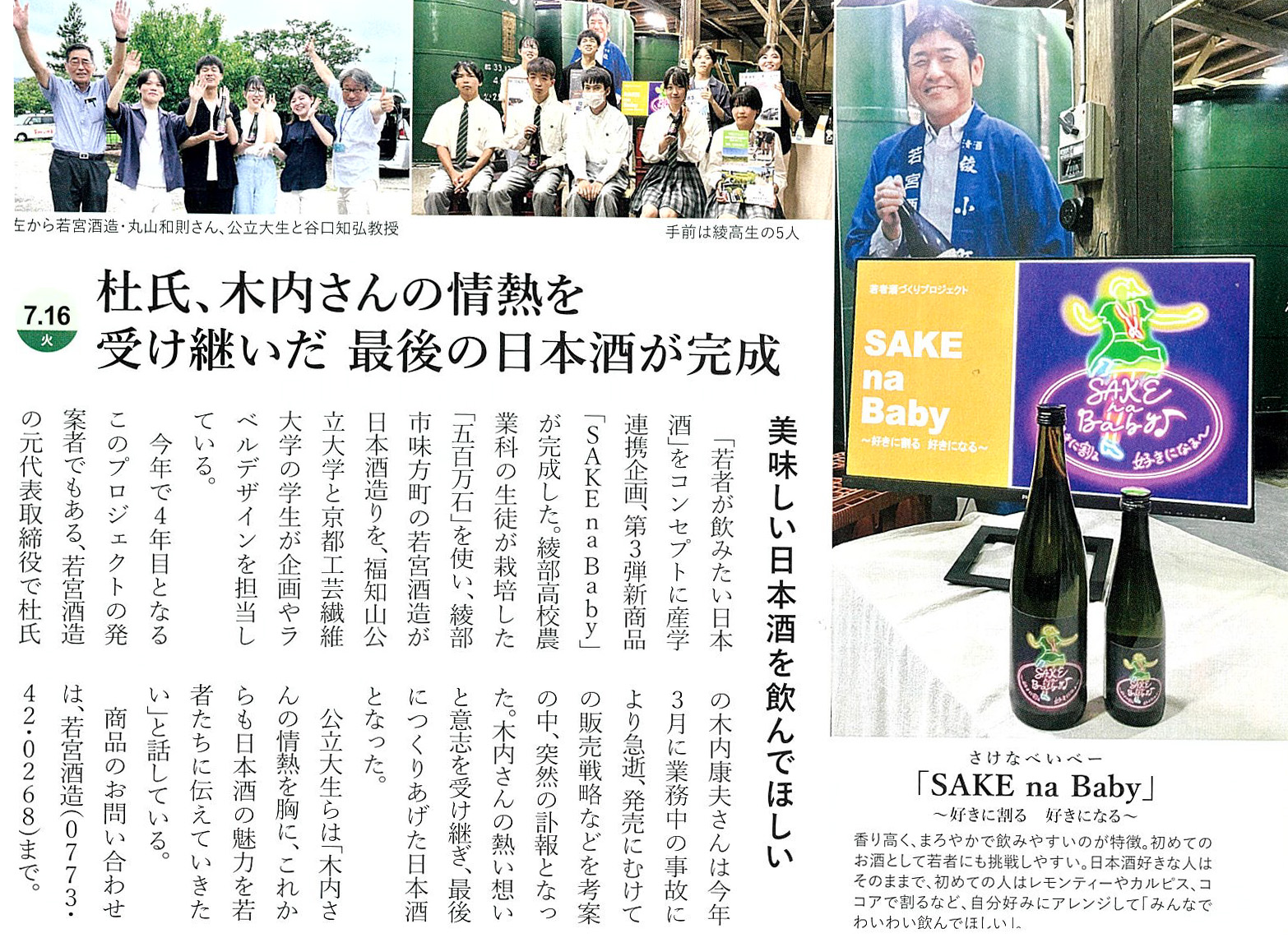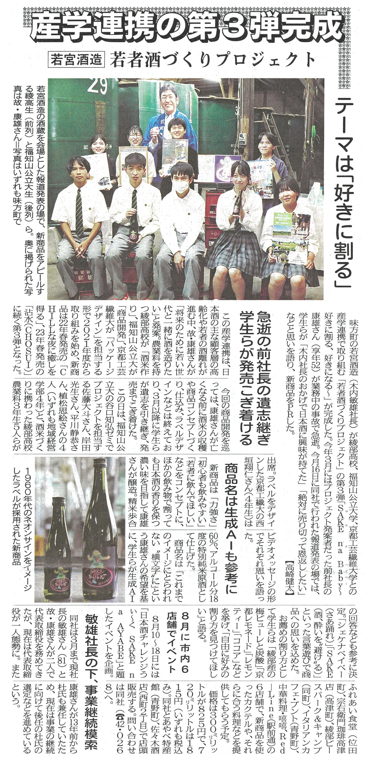- あやべ市民新聞社 2024年7月17日(水)1面「産学連携の第3弾完成 若宮酒造 若者酒づくりプロジェクト」