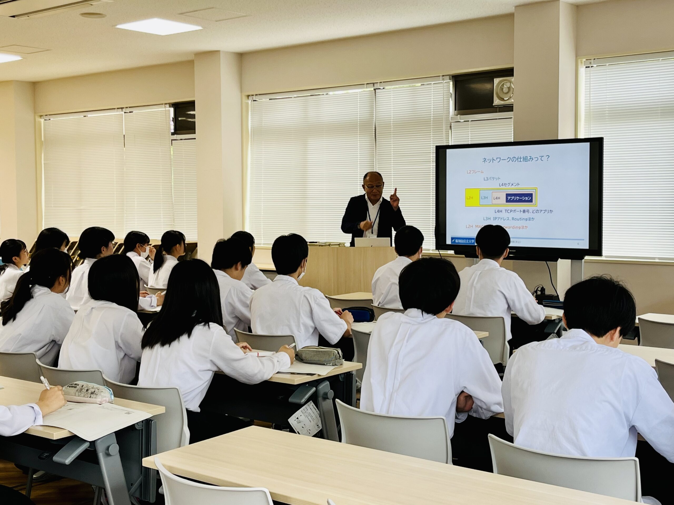 2024年7月24日(水)、京都府立西舞鶴高等学校の理数探究科2年生37人の皆さんが、科学体験合宿「サイエンスキャンプ」の一環で情報学部を見学されました。