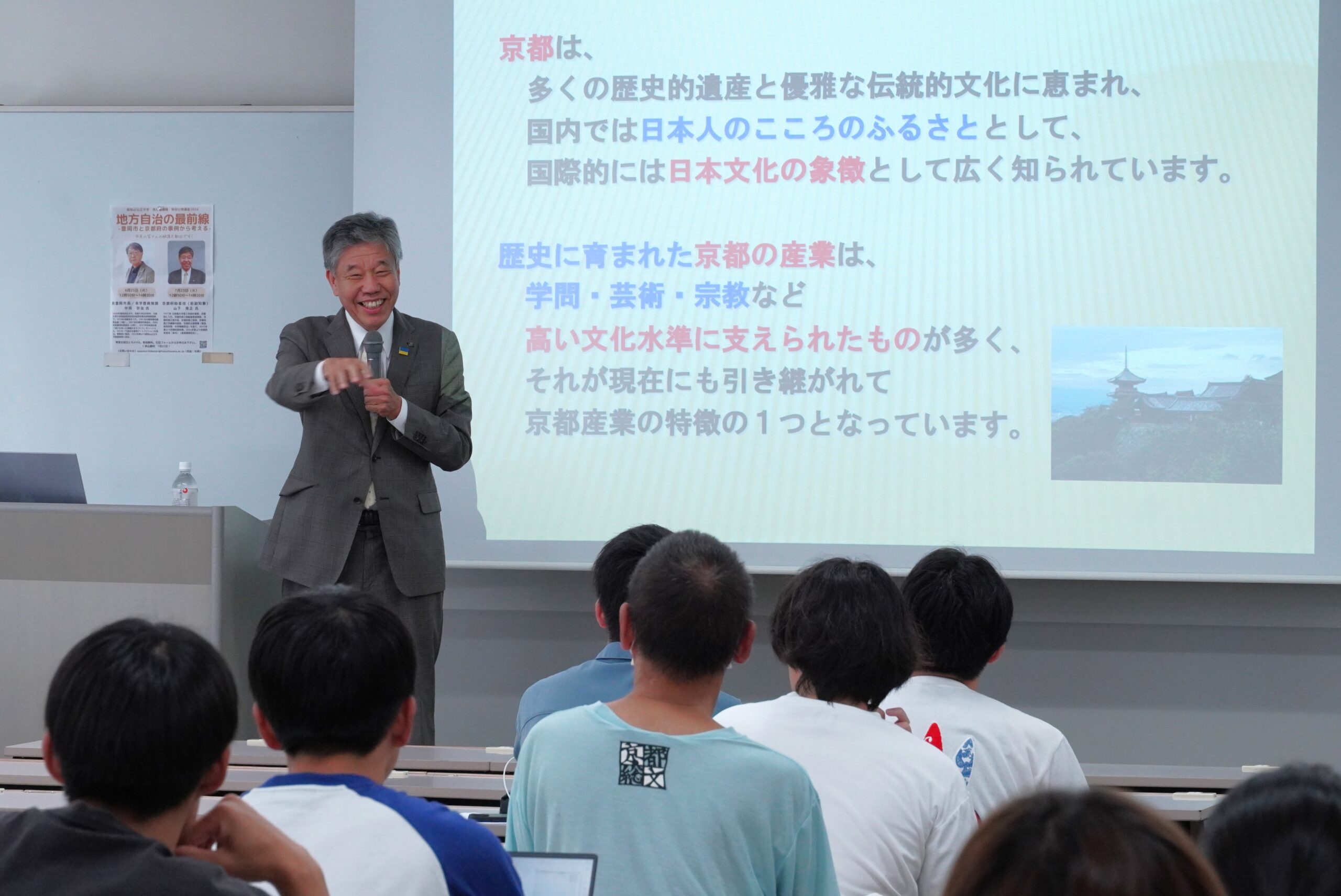 2024年7月23日(火)、地域経営学部の講義「地方自治論」(担当:杉岡秀紀准教授)の一環として、特別公開講座「地方自治の最前線-豊岡市と京都府の事例から考える-」を本学で開催し、前京都府副知事で現在は京都府助言役(参与)の山下晃正氏をゲストスピーカーに招聘しました。