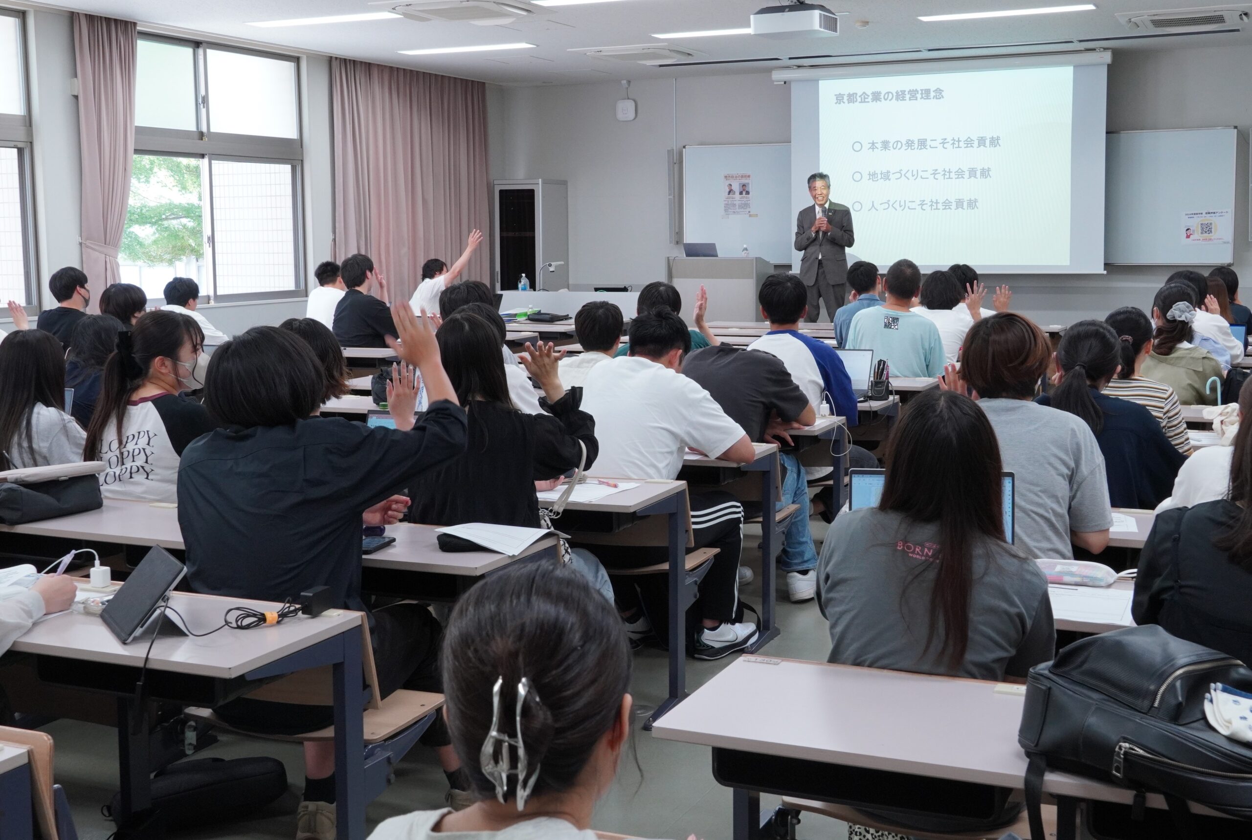 講義では「京都発・新産業の創出」をテーマに、京都の産業は学問・芸術・宗教など高い文化水準に支えられたものが多く、世界に類を見ない産業になったことや、老舗企業の経営の価値観について、今後の京都の成長イメージの説明などが行われました。