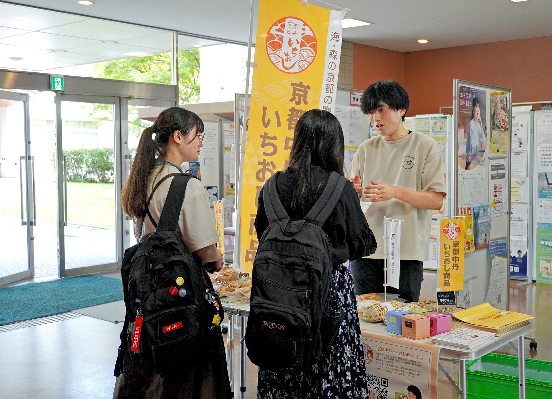 2024年7月30日(火)から8月7日(水)までの7日間、地域経営学部・張明軍准教授のゼミ生が京都府中丹広域振興局からの委託で取り組む『「京都中丹いちおし商品」の市場拡大戦略に関する研究』の一環で、商品の一部を学内販売しています。