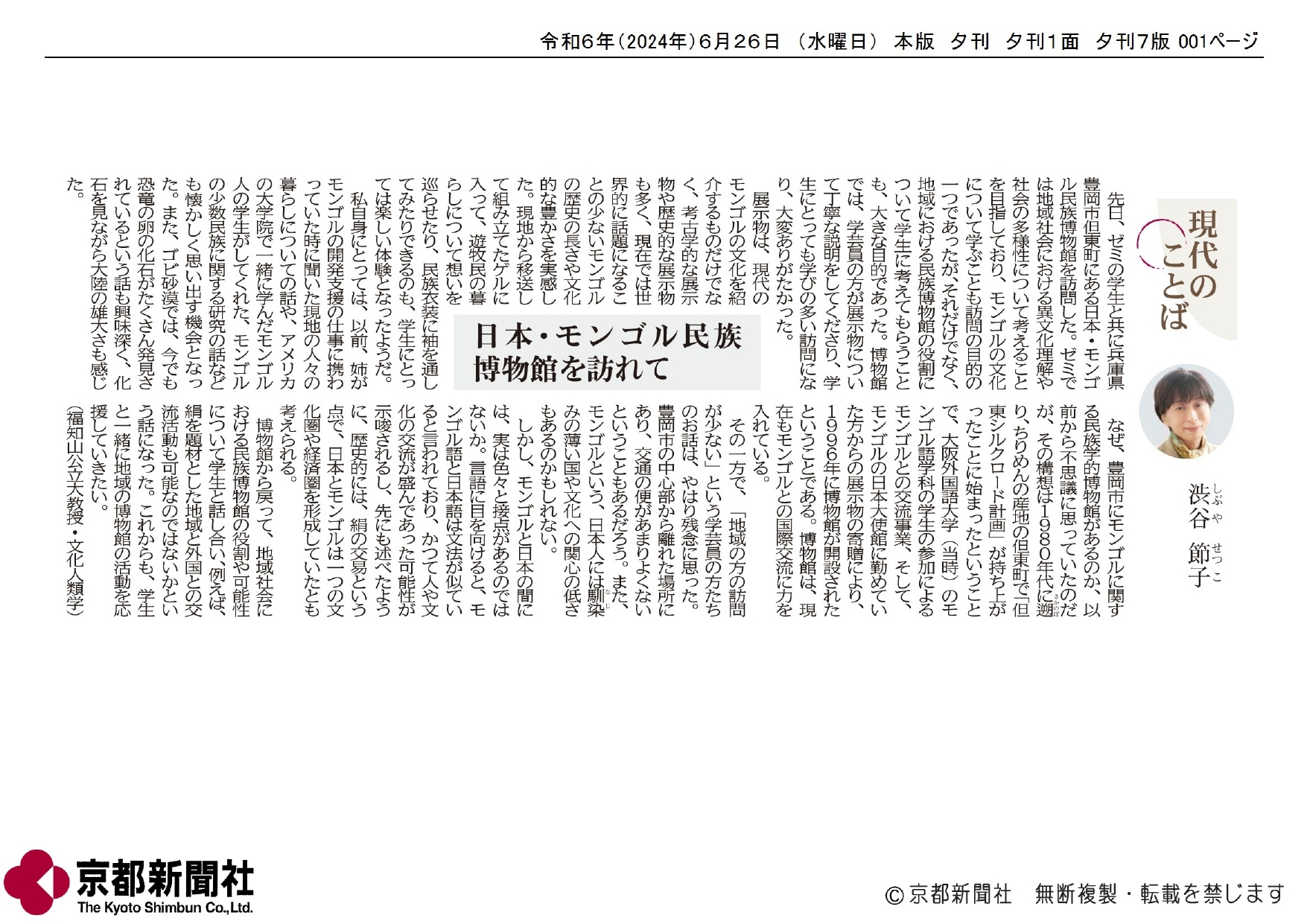 京都新聞「現代のことば」(2024年6月26日付け )に渋谷節子教授が寄稿しました。